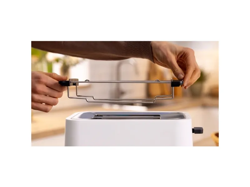 The Bosch MyMoment TAT3M121 toaster is designed to elevate the breakfast experience with its blend of style and functionality. Featuring a sleek plastic design, it offers a bun warmer accessory, making it a choice for toasting bread and warming buns simultaneously. The toaster allows for a range of toasting options with seven browning levels, ensuring results for every preference. With self-centering slots and a high lift facility, users can easily retrieve their toast without the risk of burns. The auto shut-off feature provides peace of mind while the convenient cord storage keeps the kitchen tidy.