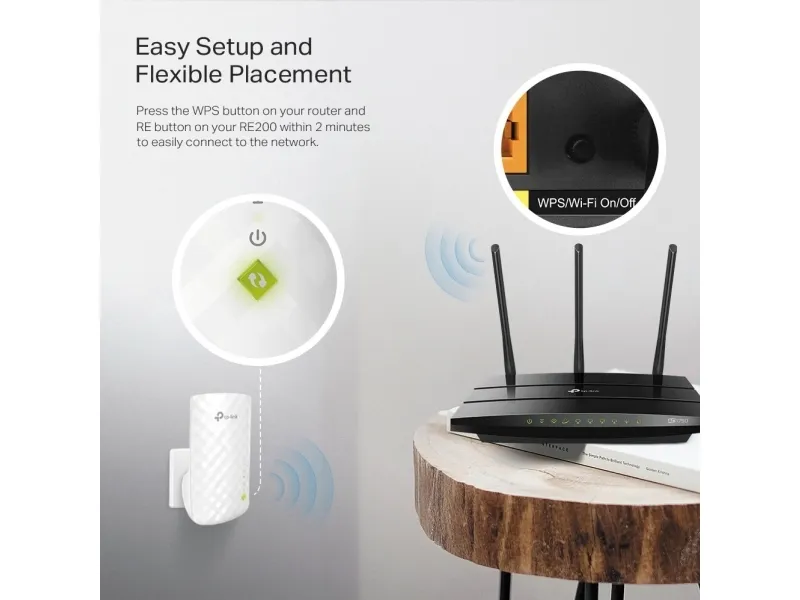 Easy Setup and Flexible PlacementPress the WPS button on your router and the Range Extender button on your RE200 within 2 minutes to easily connect to the network. Once connected with an existing router, you can simply unplug and plug the RE200 back in a location for the best signal quality and coverage in your house, without needing to configure the extender again. |