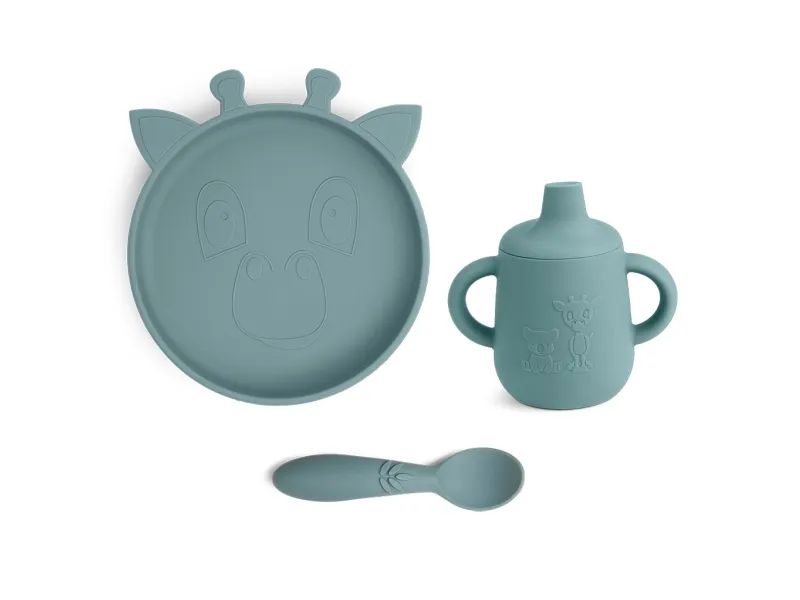 Tre af nuuroo's bedste serviceprodukter i LFGB silikone - samlet i et sæt. Dette set indeholder en tallerken, kop med tud og en ske. Silikonen er uden nogen skadelige kemikalier, og er et godt alternativ til porcelænsservice da det ikke går i stykker hvis det bliver tabt på gulvet.