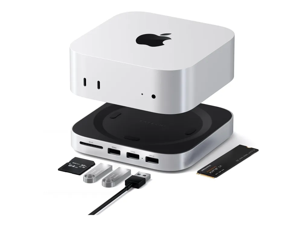 Den har spor for M.2 2280-utvidelse samt et SD UHS-II-minnekort, noe som gjør den praktisk for brukere som trenger rask tilgang til data og overføringshastigheter. Den stasjonære formfaktoren sikrer et stabilt oppsett, noe som gjør den egnet for både profesjonell og personlig bruk. Opplev sømløs tilkobling med Satechis pålitelige design og funksjonalitet.