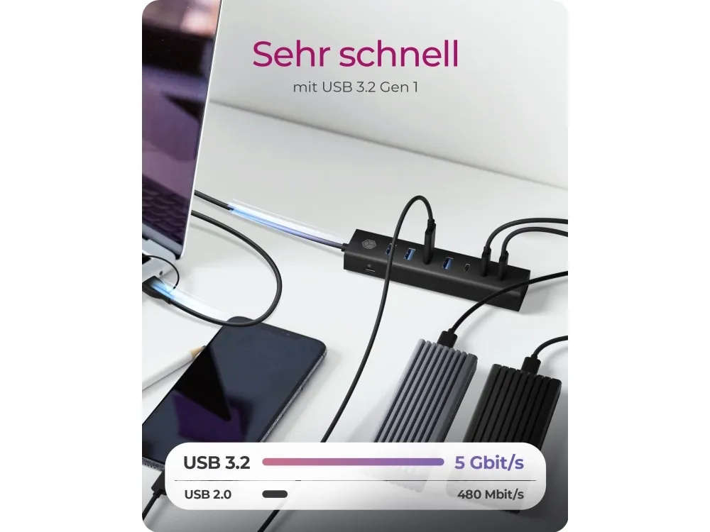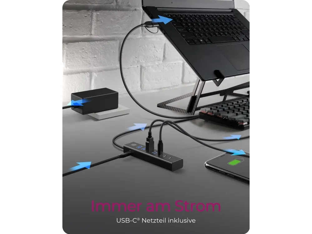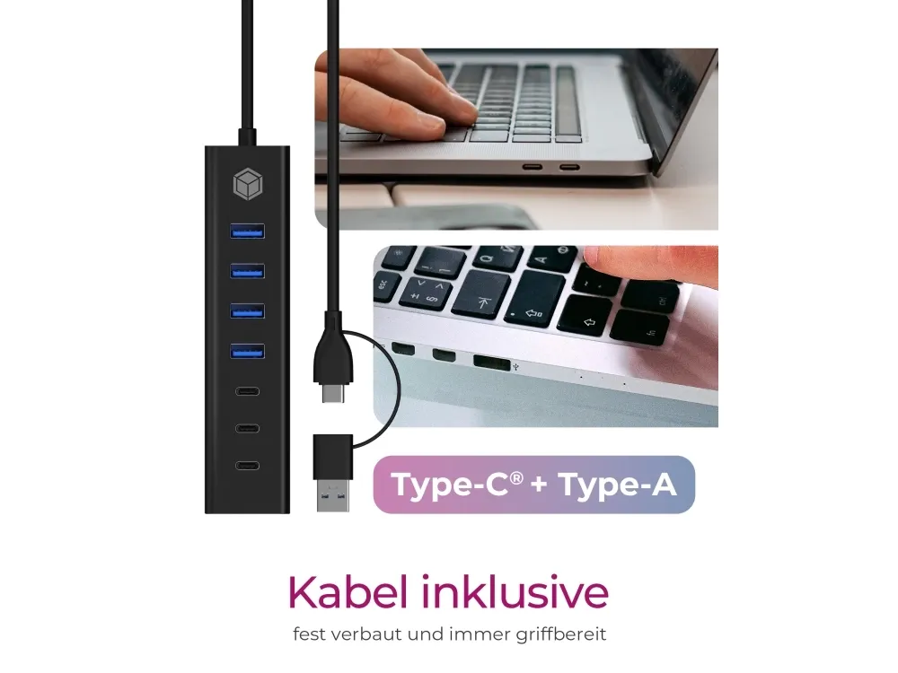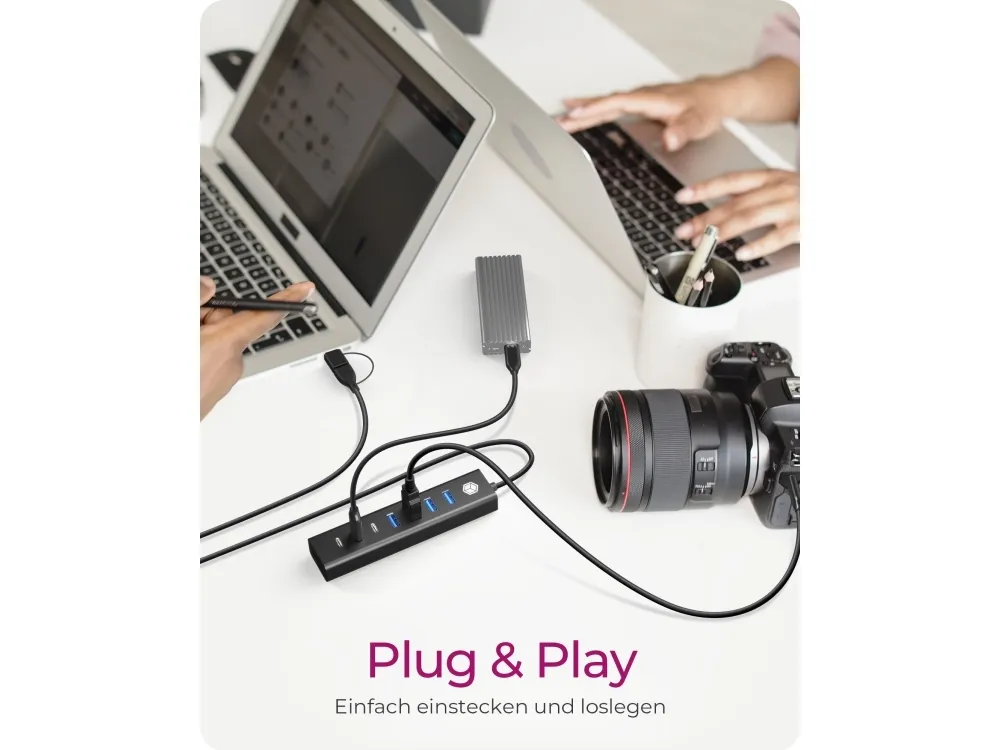 The RaidSonic ICY BOX IB-HUB1737-C3 is a versatile USB hub designed to enhance connectivity options for desktop use. Featuring aluminum housing, this hub provides a practical solution with a total of seven ports, including four USB 3.2 Gen 1 ports and three USB-C 3.2 Gen 1 ports. With a data transfer rate of 5 Gbps, it ensures quick data handling for various devices. The Plug-and-Play functionality simplifies setup, allowing users to expand device connections effortlessly. An external power adapter supports the hub, ensuring reliable performance across multiple connected devices.