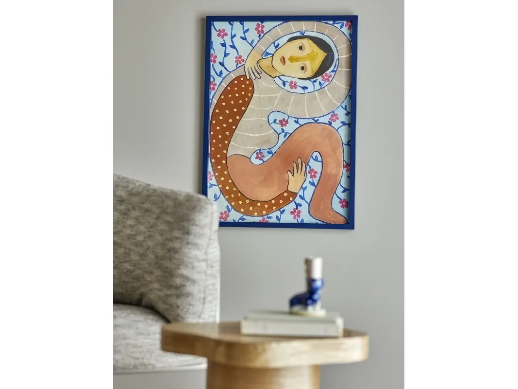 Floriesta Illustrationen med ramme fra Bloomingville er et indrammet kunsttryk på papir i en dyb blå ramme af fyrretræ med MDF og glas. Motivet viser en stiliseret figur på en blød, blomstrende baggrund i rosa og blå. Produktet er lavet af naturmaterialer, så der kan forekomme farvevariationer, hvilket gør hvert eksemplar unikt.