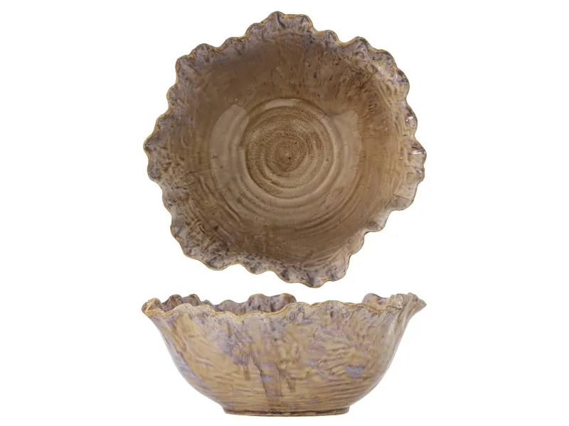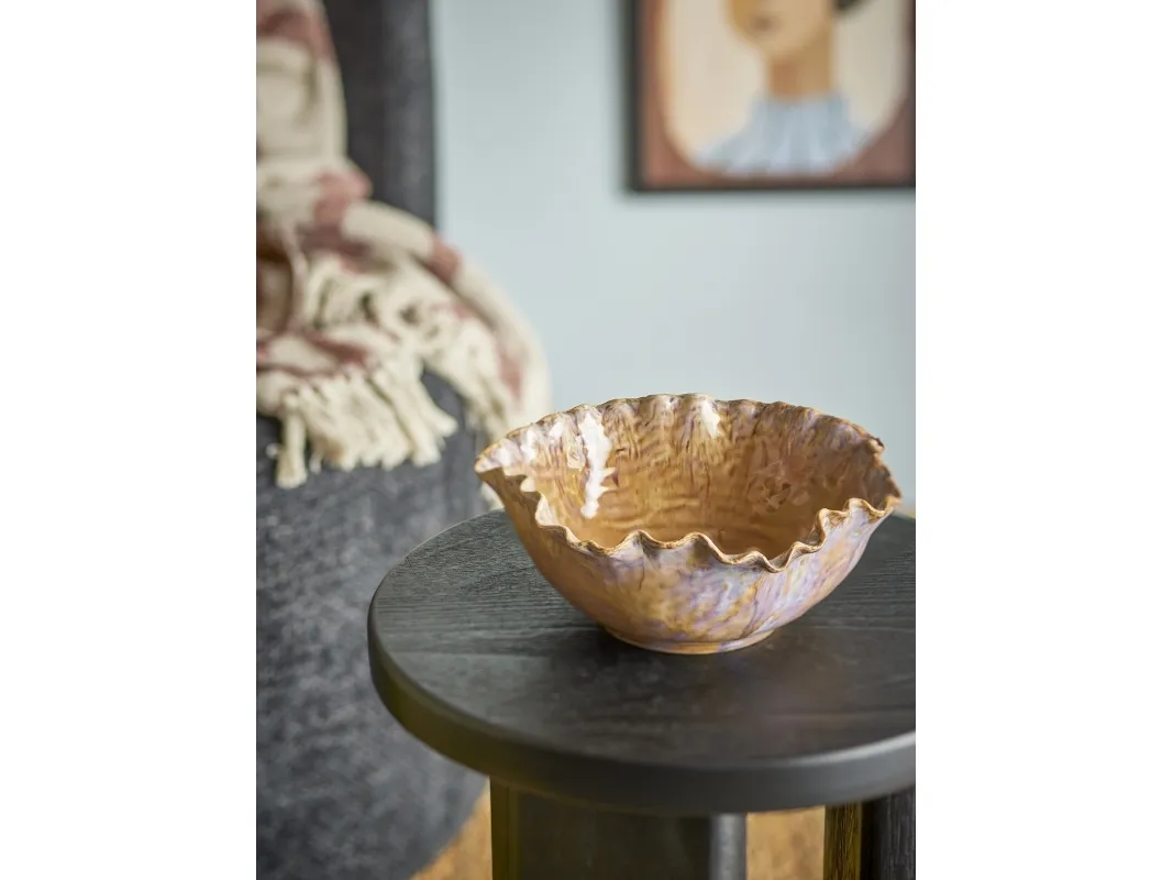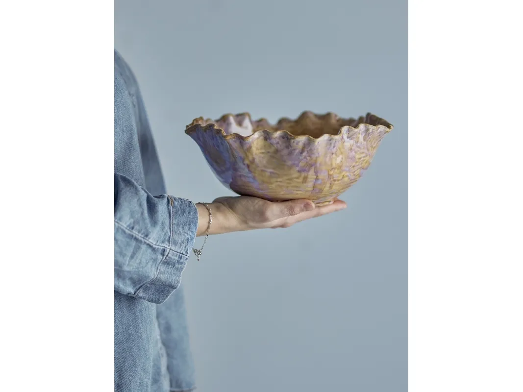 Nash Skålen fra Bloomingville er fremstillet af stentøj med en reaktiv glasur i lyse nuancer og en bølget kant. Skålens levende farvespil gør den ideel som både serveringsskål og dekorativ detalje. Glasurens natur kan medføre variationer i farven, hvilket sikrer, at hver skål er unik.