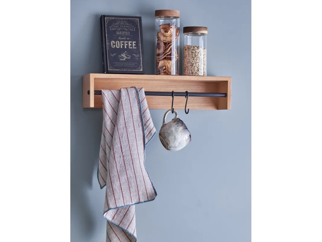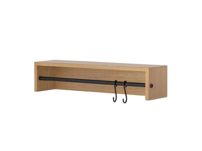 Ryder Hylden fra Bloomingville fremstår med en varm træfarvet overflade og understøttes af ophæng og en stang i sort metal. Brug de to inkluderede kroge til at hænge viskestykker eller dine yndlingskopper op. Ovenpå hylden kan du anbringe bøger eller krydderier, hvilket skaber en hyggelig og indbydende stemning i dit rum.