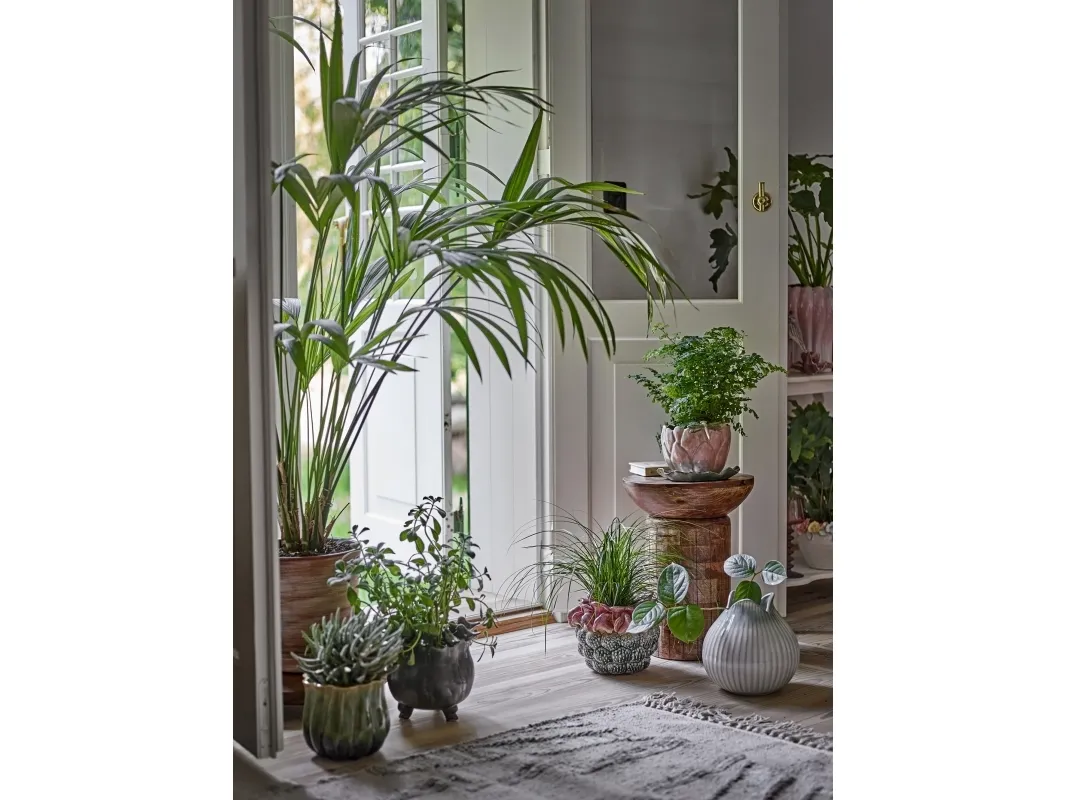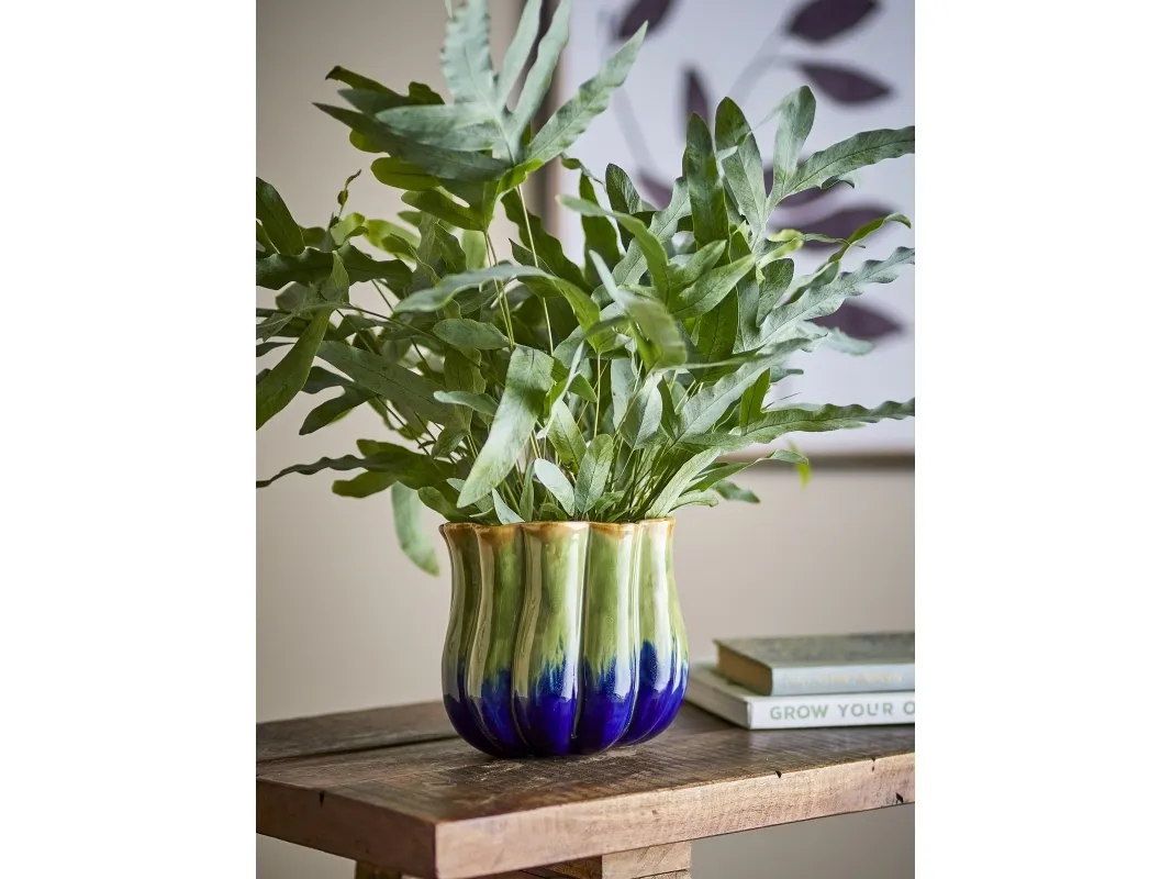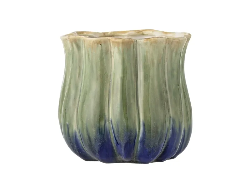 Jenner Urtepotteskjuleren fra Creative Collection er udført i stentøj og afsluttet med en reaktiv glasur, der skaber fine variationer i overflade og tone. Den blødt bølgede form har lodrette riller og et spil af grøn og blå ved bunden, med beige detaljer mod randen. Små variationer i mønster og farveintensitet kan forekomme, hvilket gør hvert eksemplar unikt.