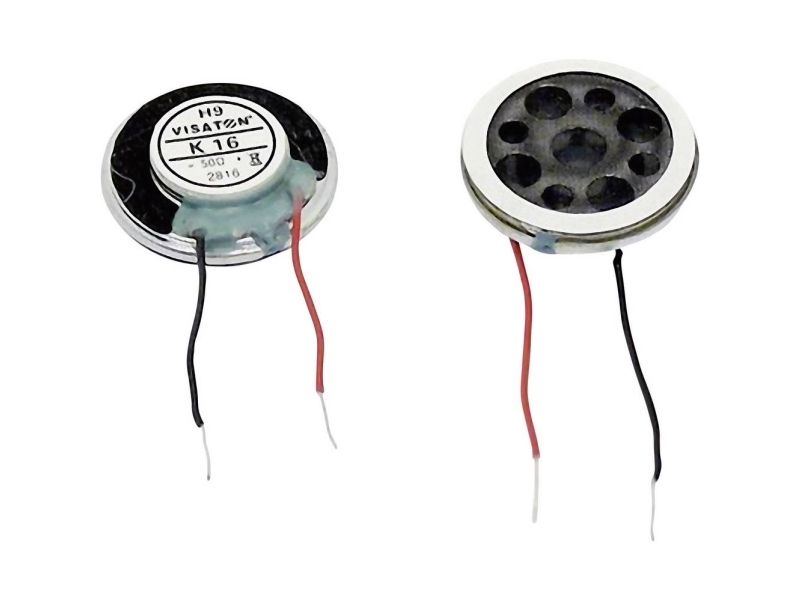 16 mm miniature højttaler med meget små dimensioner og en frontmonteret klæbende overflade. Tilslutning sker gennem allerede afisolerede kabel. Applikationer: micro, model byggeri og signal output.
