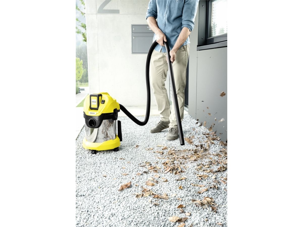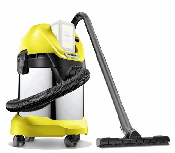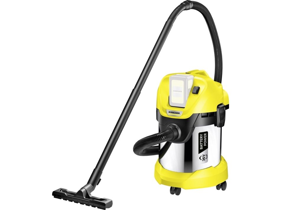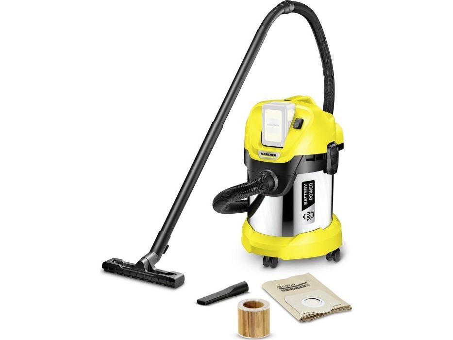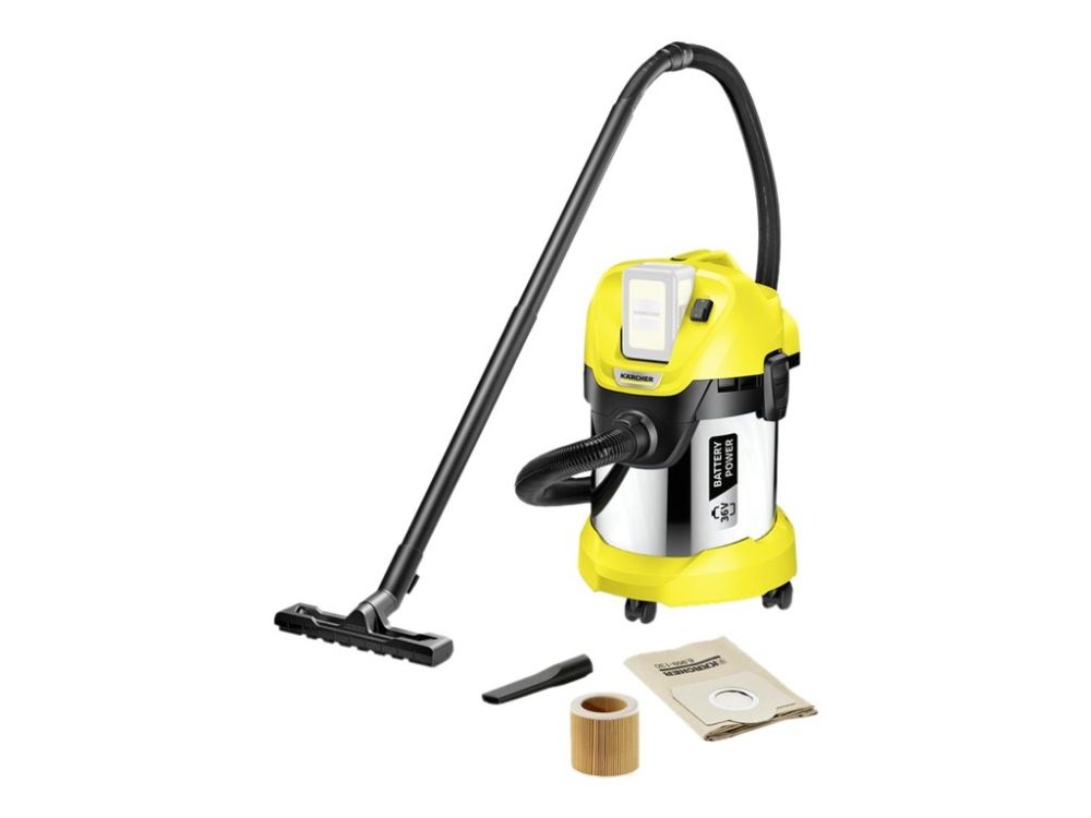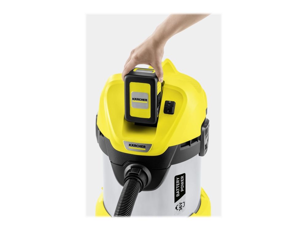 The battery-powered multi-purpose vacuum cleaner WD 3 Battery Premium does not just offer maximum freedom of movement during vacuuming. It has a whole range of advantages to impress you with. For example, the extremely stable stainless steel container with a capacity of 17 litres. A cartridge filter which makes vacuuming both dry and wet dirt incredibly easy without ever changing the filter. The detachable handle for attaching accessories directly to the flow-optimised suction hose. A clips floor nozzle including mixed inserts for ideal dirt pick-up. A running time of 15 minutes with the 36 V/2.6 Ah Li-Ion exchangeable battery and 30 minutes with the 36 V/5.2 Ah Li-Ion exchangeable battery (not included in the scope of supply). A parking position for the suction tube and floor nozzle. Additional extras include the blower function, the Pull & Push locking system, the ergonomic carrying handle and the extremely practical accessory storage.