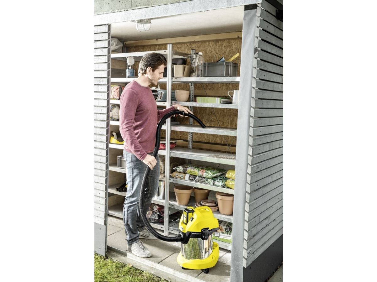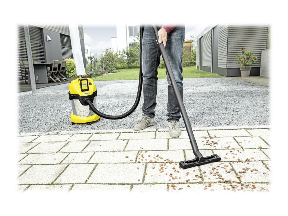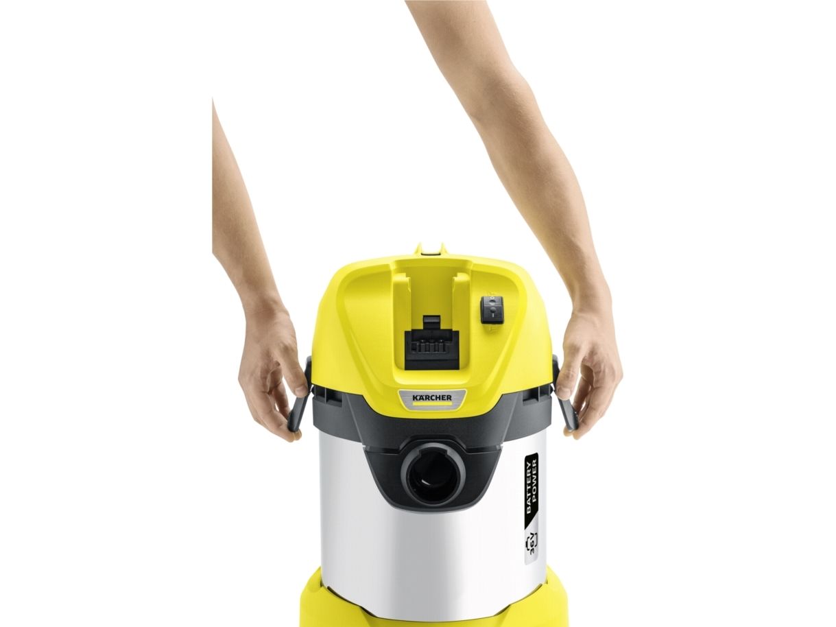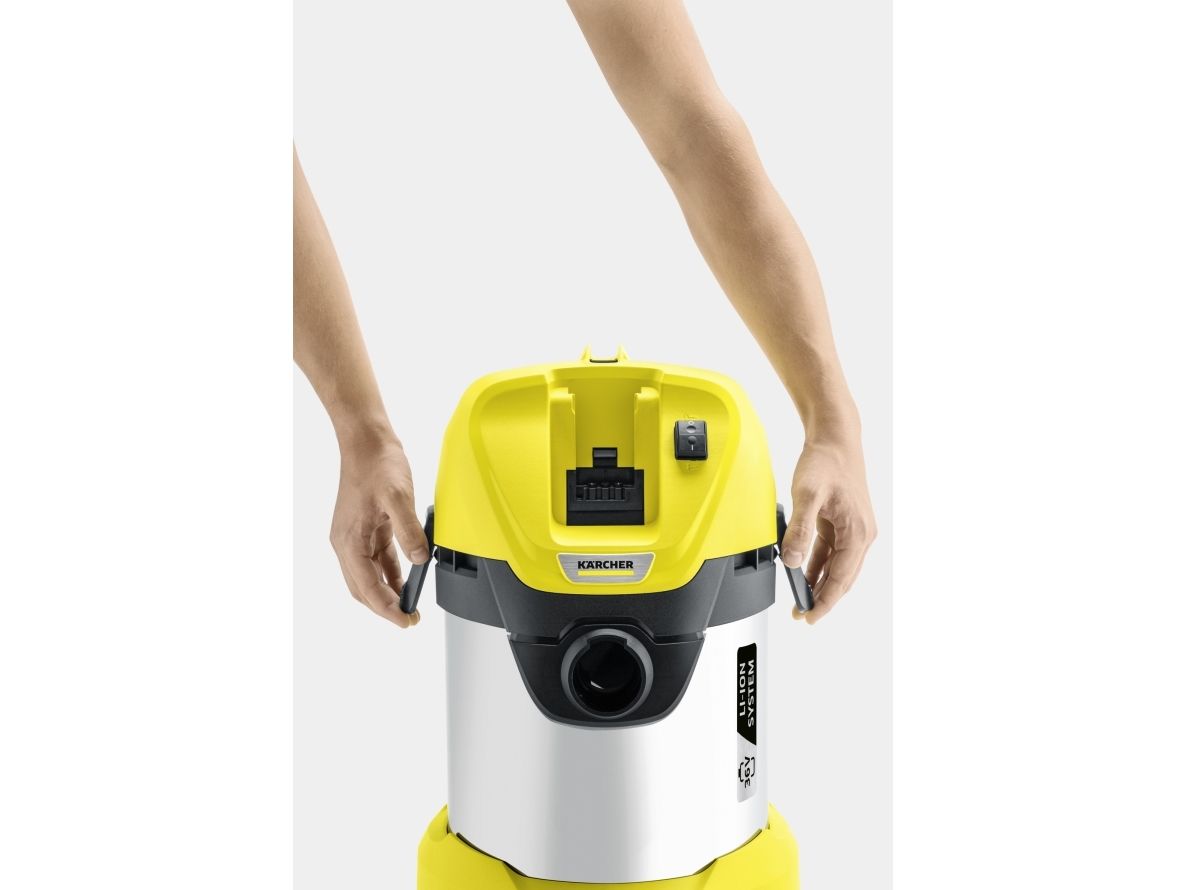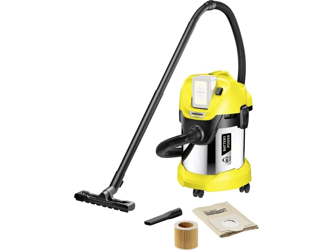 The battery-powered multi-purpose vacuum cleaner WD 3 Battery Premium does not just offer maximum freedom of movement during vacuuming. It has a whole range of advantages to impress you with. For example, the extremely stable stainless steel container with a capacity of 17 litres. A cartridge filter which makes vacuuming both dry and wet dirt incredibly easy without ever changing the filter. The detachable handle for attaching accessories directly to the flow-optimised suction hose. A clips floor nozzle including mixed inserts for ideal dirt pick-up. A running time of 15 minutes with the 36 V/2.6 Ah Li-Ion exchangeable battery and 30 minutes with the 36 V/5.2 Ah Li-Ion exchangeable battery (not included in the scope of supply). A parking position for the suction tube and floor nozzle. Additional extras include the blower function, the Pull & Push locking system, the ergonomic carrying handle and the extremely practical accessory storage.