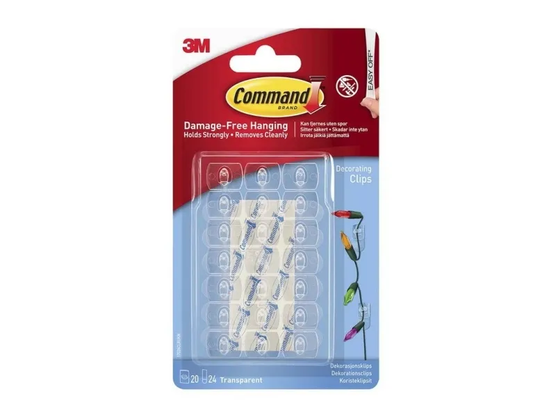 Ophængning uden skader, med god klæbeevne og aftagning uden sporLet at sætte op – du behøver hverken søm, skruer eller boremaskineCommand™ strips strækkes af – uden at efterlade huller, mærker eller klæberesterDe diskrete gennemsigtige kroge og strips passer ind i ethvert interiørEgnet til de fleste glatte overflader, herunder malede vægge, fliser, metal og træBæreevne: Brug 1 clips for hver 30-60 cm lyskædePakkeindhold: 20 clips og 24 ministripsStørrelse: MiniFarve: GennemsigtigStriptype: Indendørs, gennemsigtigSe brugsanvisningerne: Efter montering på væggen skal du vente 1 time, før du hænger noget på krogen/strippen. Ideel til massive, hule og malede vægge. Anvend ikke på tapet, vinyloverflader eller andre sarte eller svage overflader. Anvend ikke på vinduer.Command™ gennemsigtige dekorationsclips med gennemsigtige strips er vores innovative løsning til ophængning af lyskæder og årstidsdekorationer – så bliver tingene hængende, og du undgår skader. De klæber godt fast og fjernes uden spor i kraft af 3M strækteknologien.Command™ gennemsigtige dekorationsclips med gennemsigtige strips giver effektiv ophængning indendørs uden skader. De klæber godt fast på flere forskellige overflader, herunder massive, hule og malede vægge, foruden materialer som træ, fliser, metal og glas. De er lette at sætte op og kan fjernes uden at efterlade huller, mærker eller klæberester. Vores diskrete gennemsigtige kroge og strips passer ind overalt og egner sig til alle rum i huset eller på kontoret. Med Command™ gennemsigtig refillstrip kan du frit tage dem ned, flytte dem og bruge dem igen og igen.Foreslåede anvendelserAnvendes til ophængning af lyskæder og LED-kæder året rundt eller i kortere perioder som f.eks. jul og andre festlige anledningersoveværelse, skab, køkken, gang, garderobe, campingvogn, kontorEgnet til soveværelser, skabe, køkkener, entreer og gangarealer, garderober, campingvogne og kontorer.
