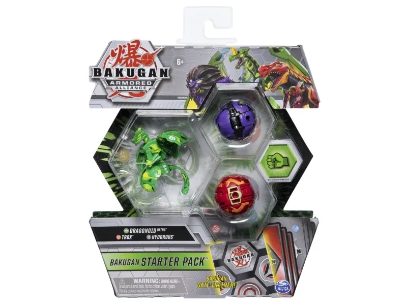 Bakugan Starter Pack har alt du trenger for å bli en mektig Bakugan Brawler. To episke Armored Alliance Bakugan, en mektig Bakugan Ultra, seks kraftfulle BakuCores, tre karakter kort og tre evne kort. Alder 6+.
