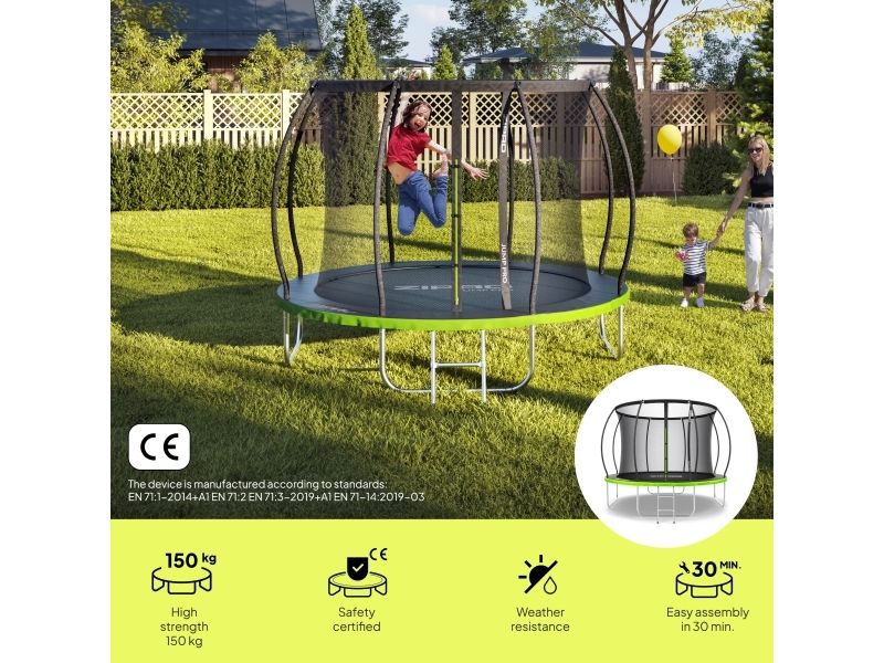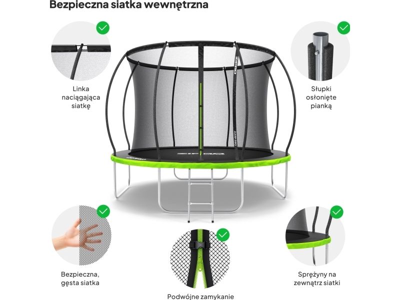 Nettet i denne modellen er av typen innvendig, noe som betyr at fjærene er utenfor hoppområdet. Bøyde stenger gir avstand mellom nettet, forhindrer risiko for kontakt med trampolinekonstruksjonens komponenter. Bruken av klikkmontering gjør hele systemet mer effektivt og bekvemt ved installasjon. Stengene er dekket med 10 mm tykt skum. I tillegg er den øvre delen av nettet forsterket med en snor.