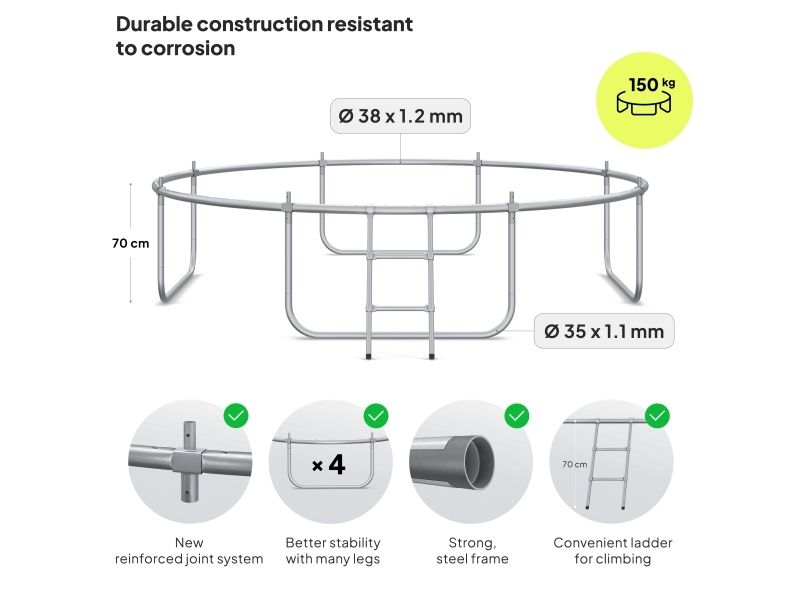 Trampolinens ramme er laget av galvanisert stål for å beskytte komponentene mot værpåvirkninger. Rammens rør har en diameter på 38 mm og en veggtykkelse på 1,2 mm.