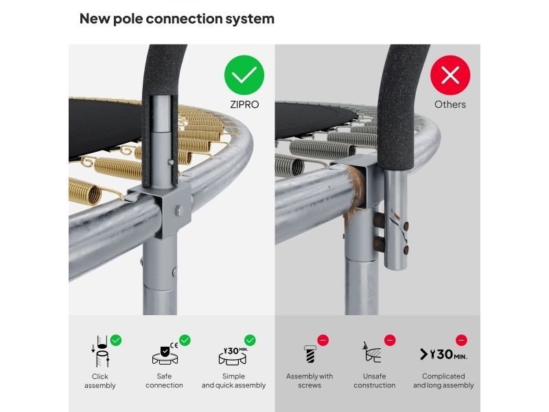 I ZIPRO-trampoliner er det implementert et forbedret festesystem der elementet CROSS-SECTION kobler rammen med benene og nettingstigningene. Skruene sikrer ytterligere forsterkning av forbindelsene. Denne innovasjonen sørger for mer dynamisk og effektiv drift, noe som øker ytelsen og letter monteringen.