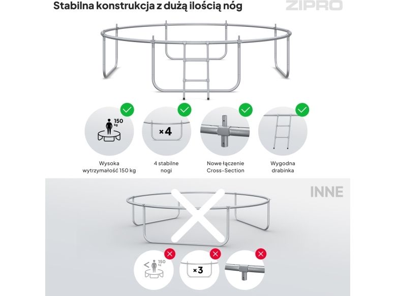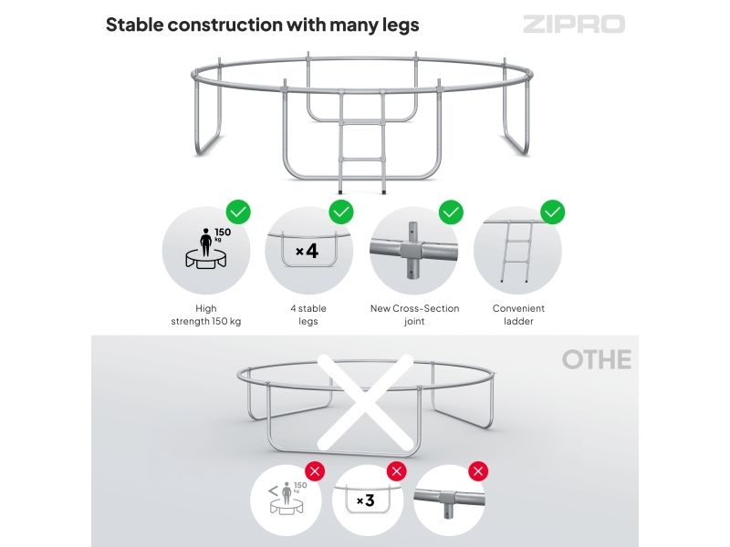 ZIPRO-trampolinene har et økt antall ben sammenlignet med andre produkter. Kreftene som virker på konstruksjonen under hopping fordeles bedre, noe som resulterer i jevn belastning, stabilitet og sikkerhet. De er konstruert av værbestandig galvanisert stål, akkurat som rammen.