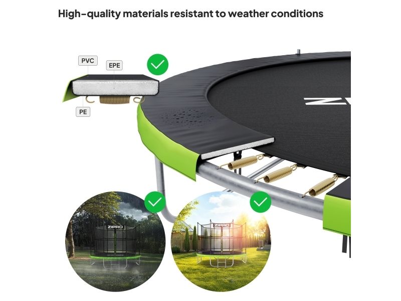 Matten, nettet og beskyttelsen er værbestandige, slik at trampolinen kan brukes selv på solfylte dager. Kortvarige værforstyrrelser vil heller ikke skade den. I tillegg er trampolinematten laget av høy tetthet polypropylenmateriale, slik at bare litt sol eller vind er nødvendig for raskt å tørke opp fuktighet akkumulert under regn.