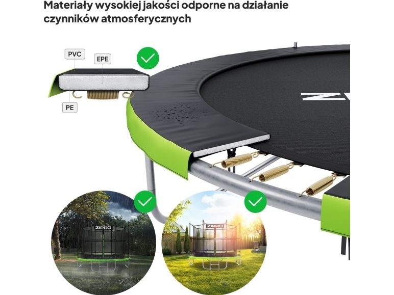 Sikkerhet og kvalitet i utførelsen er øverste prioritet i konstruksjonen av ZIPRO-trampoliner. Materialene som den er laget av, sikrer at selv ved langvarig og intensiv bruk opprettholdes høyeste sikkerhetsnivå.