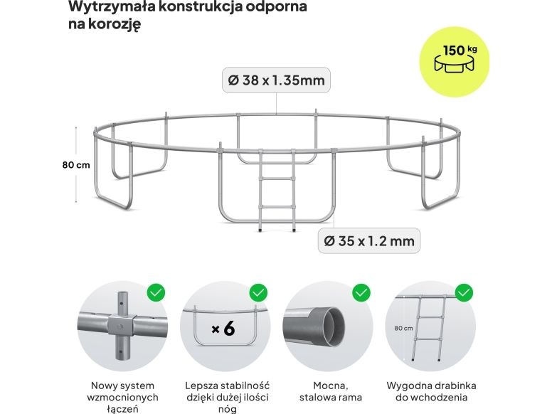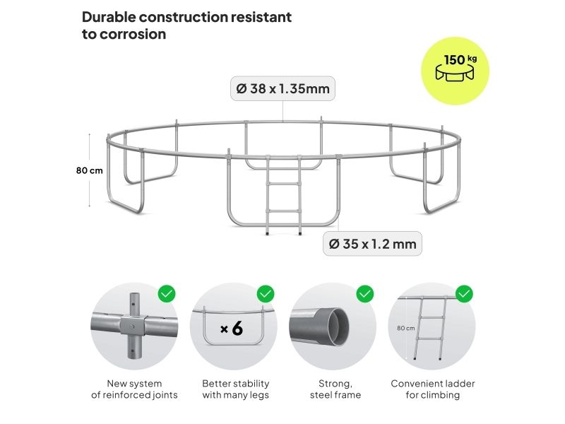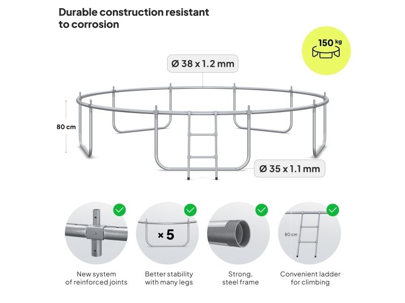 Rammen på trampolinen er laget av galvanisert stål for å beskytte elementene mot værforhold. Rør i rammen har en diameter på 32 mm og en veggtykkelse på 1,1 mm.