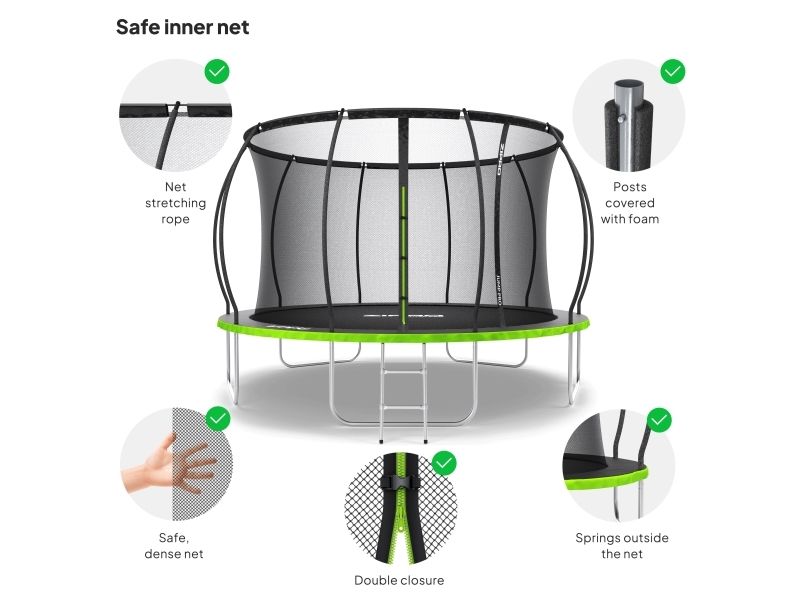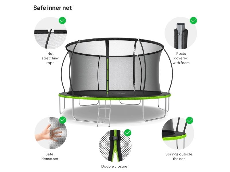 Trampolinen er omgitt av et nett med en høyde på 180 cm. Nettmasker har en diameter på 3 mm. Alt for å beskytte brukerne fra ved et uhell å sette fingrene mellom nettet, samt gi muligheten for et trygt grep og enda bedre sikring.