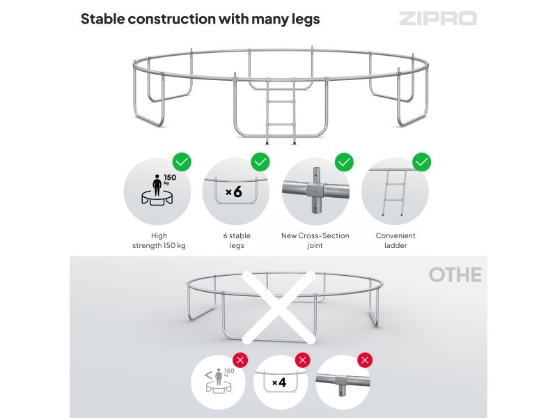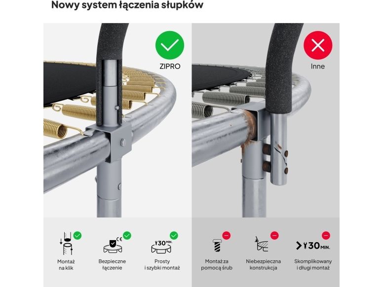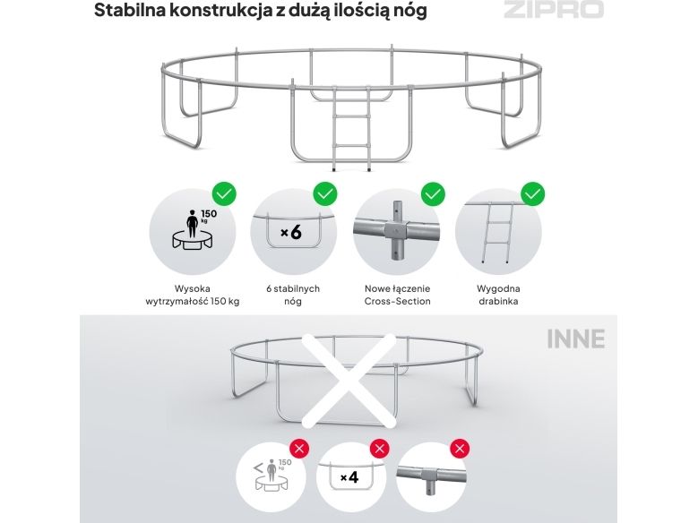 Trampolinene ZIPRO har et forbedret monteringssystem der CROSS-SECTION-elementet forbinder rammen med bena og nettstolpene. De mest belastede områdene er dermed forsterket. Denne innovasjonen sikrer mer dynamisk og effektiv drift, noe som resulterer i økt ytelse og enkel montering.