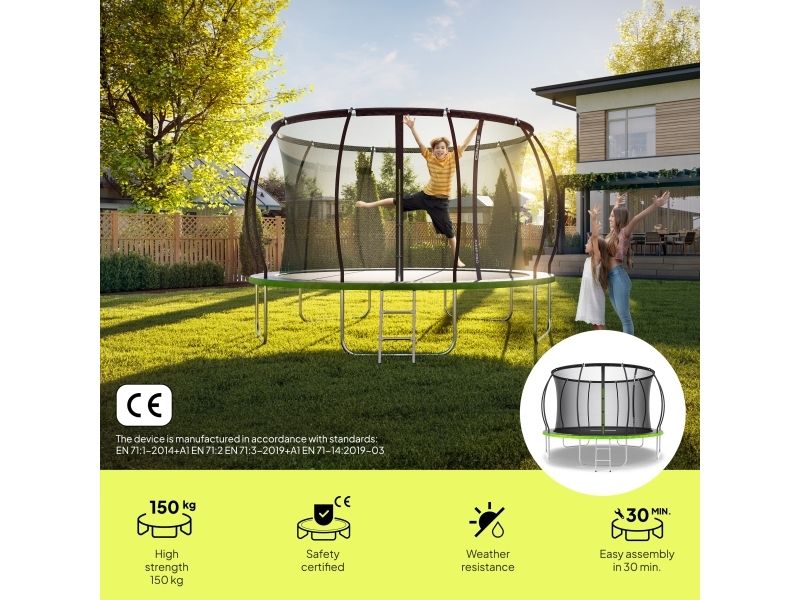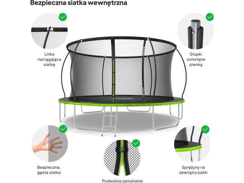 Nettet i denne modellen er av intern type, noe som betyr at fjærene er utenfor hoppeområdet. Buede stolper sikrer avstand mellom nettet uten risiko for tilfeldig kontakt med konstruksjonselementer. Klikk-lås som en festemetode gjør hele systemet mer effektivt og enkelt å montere. Stolper er dekket med 10 mm tykk skum. I tillegg er topplinjen til nettet forsterket med en snor.