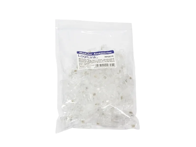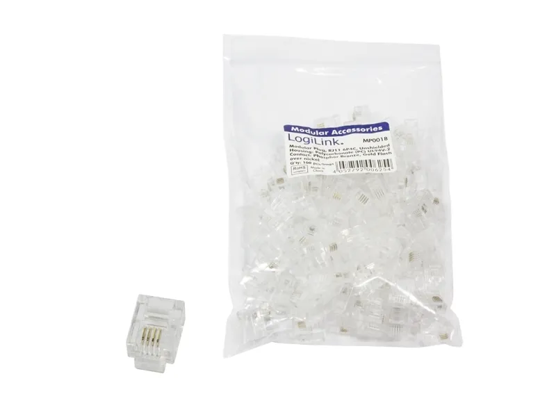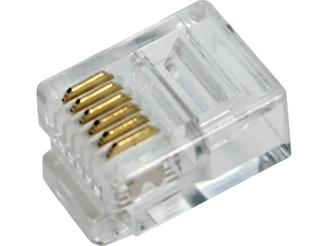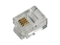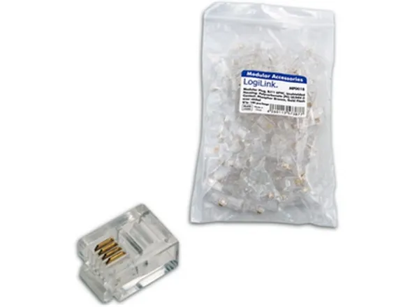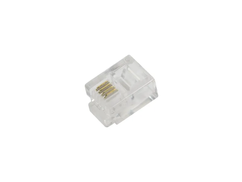 - Modular Plug for flat cable;\n- RJ11 6P4C;\n- Unshielded;\n- Gold plated contacts;\n- 100 pieces.