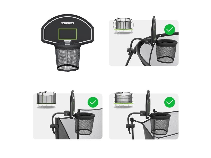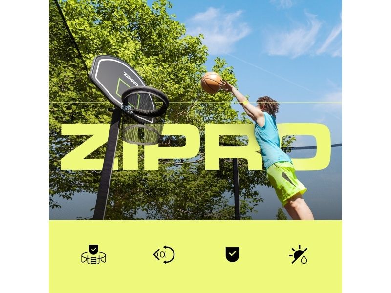 Trampolinen ZIPRO tilbyr mer enn bare hopping takket være muligheten for å kjøpe en rekke tilbehør. En av de mest interessante tilleggene er definitivt et basketballbrett med kurv, som lar enhver basketballentusiast føle seg som en profesjonell idrettsutøver. Denne gangen vil det ikke være et problem å hoppe opp til ringen og sette ballen i den, noe som definitivt øker moroa.