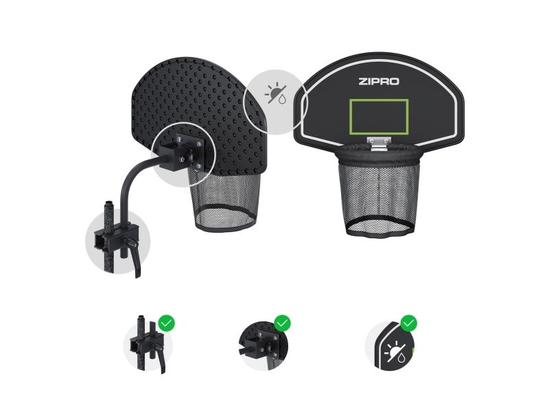 Takket være et gjennomtenkt festesystem basert på profilen festet til stangen og muligheten til å justere brettets helningsvinkel, passer basketballsettet perfekt til alle ZIPRO-trampolinemodeller. Uansett størrelse eller type nett, kan du raskt og stabilt montere kurven. Dette er en universell løsning som enkelt kan tilpasses din trampoline.