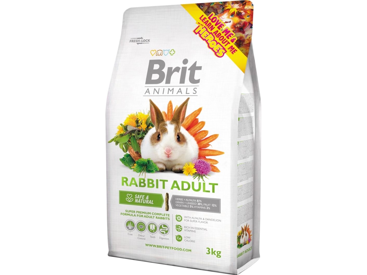 Super premium fuldfoder til voksne kaniner (20 uger - 4 år). Optimalt forhold mellem proteiner, fedtstoffer og fibre sikrer ideel fordøjelighed og næringsværdi af foderet i den voksne periode. Marietidsel (Silybum marianum) understøtter den korrekte leverfunktion og hjælper med at forebygge de mest almindelige stofskiftesygdomme. Komplet med vitaminer og næringsstoffer for vitalitet og god kondition.