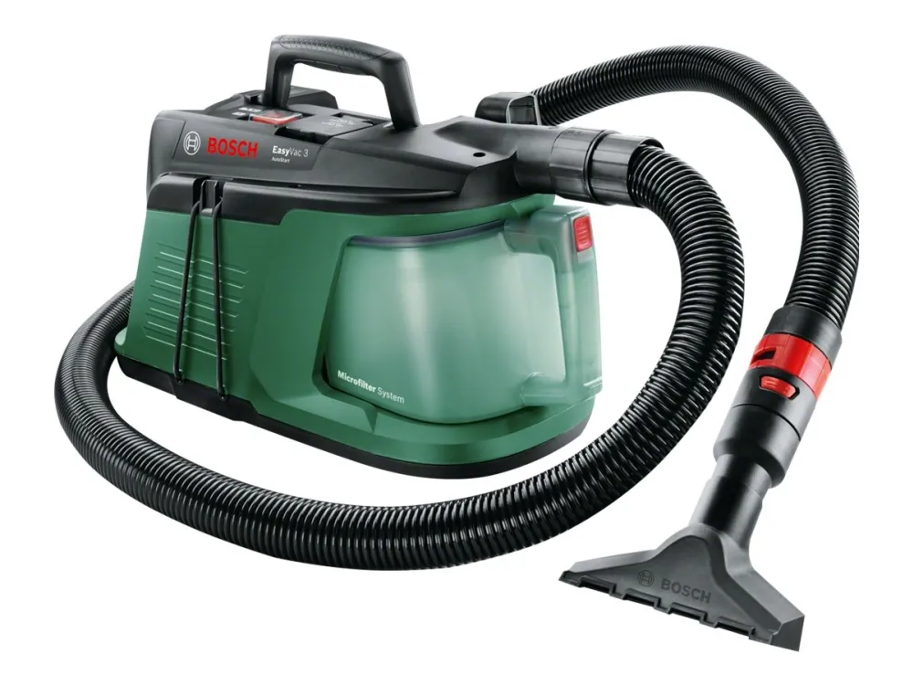 Gled deg over problemfri rengjøring, lettvint transport og enkel oppbevaring med EasyVac 3. Alt kabel- og slangetilbehør festes direkte på støvsugeren for lett og praktisk oppbevaring. Et praktisk håndtak gjør denne støvsugeren enkel å bære og lagre. Den fjerner tørt smuss og avfall på vanskelig tilgjengelige steder, på verkstedet, hjemme og i bilen. For konstant rengjøring festes denne støvsugeren direkte på elektroverktøyet fra Bosch for hjem og hage og flere andre produsenter, takket være universaladapteren og den koniske formen på denne. Den slår seg automatisk på og av i takt med verktøyet, noe som gir mye bedre håndtering og redusert rengjøringstid.
