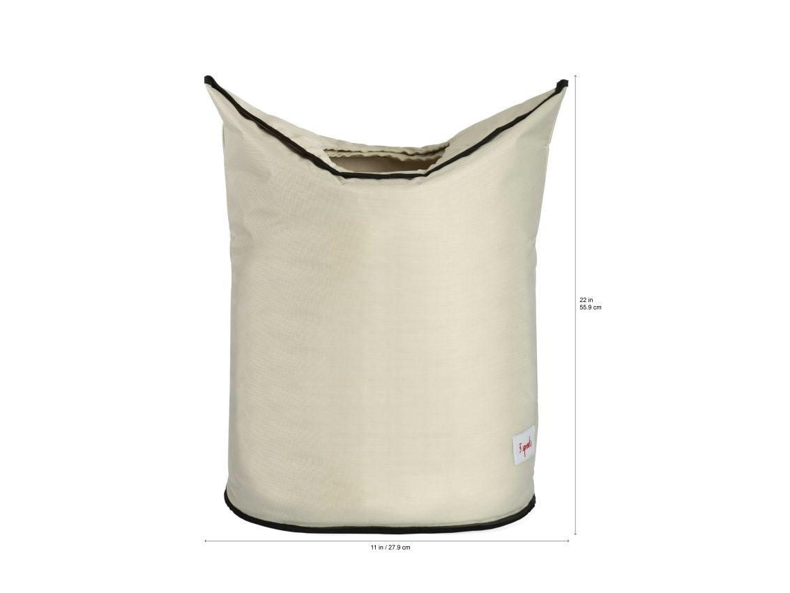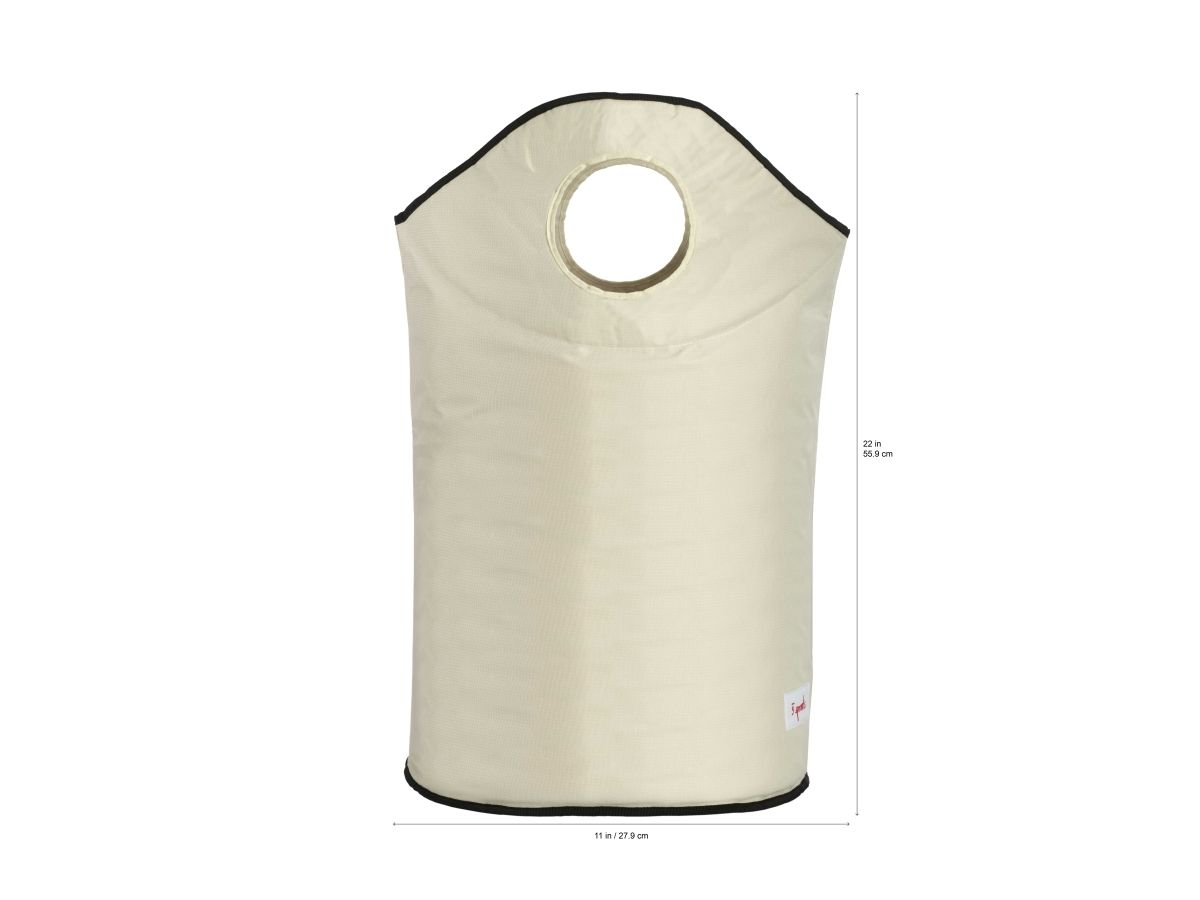 Snavsetøjskurv til børneværelse eller badeværelse. Kurvens øverste sider kan bukkes ind over hinanden, og skjuler derved tøjet i kurven. Når siderne er ind over hinanden, har du en hank at bære vaskeposen i. Posen kan foldes sammen, når den ikke er i brug.