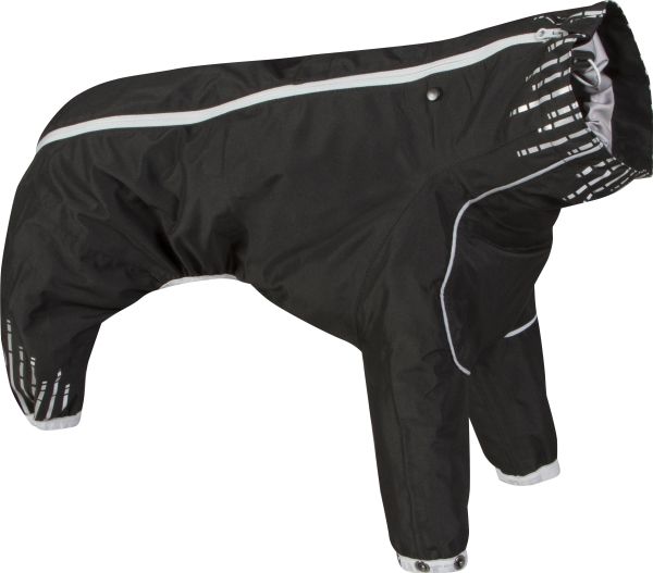Overallen har høj krave og regnfælde i kraven, som forhindrer regn i at gå ind i overallen. Produktet er lavet af slidstærkt og behageligt fleksibelt udendørs stof, der ikke rasler, når hunden bevæger sig.