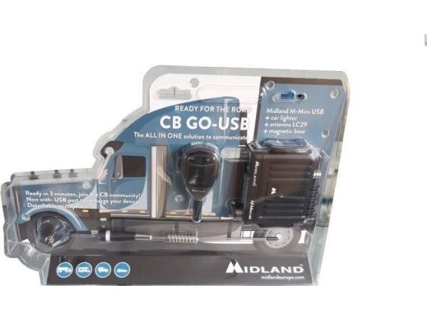 Midland CB GO USB - lastbils blister Multi-standardenhed Kanal til/fra-knapper på mikrofonen Kanalsøgning LCD-display, S-meter Automatisk squelch (ASQ) kan indstilles RF-gain Kanal 9/19 tast Tilslutning til ekstern højtaler USB-tilslutning til opladning af mobile enheder Aftagelig mikrofon med RJ45-stik Strømkabel med cigarettænder-stik Midland CB Go USB-sættet består af en Midland M-Mini USB CB-radioenhed, en håndmikrofon, en 12 V bil-oplader med cigarettænder-stik og den kompakte Midland LC29 magnetfod-antenne. Alt er pakket sammen i en formsmuk lastbil blisteremballage og kan nemt hænges op i en reol. Midland M-Mini USB kan anvendes som mobil station i bilen eller med en egnet DC-strømforsyning som basestation. Denne enhed overholder de nyeste europæiske CB-standarder. Via USB-tilslutningen kan mobile enheder som for eksempel smartphones oplades.