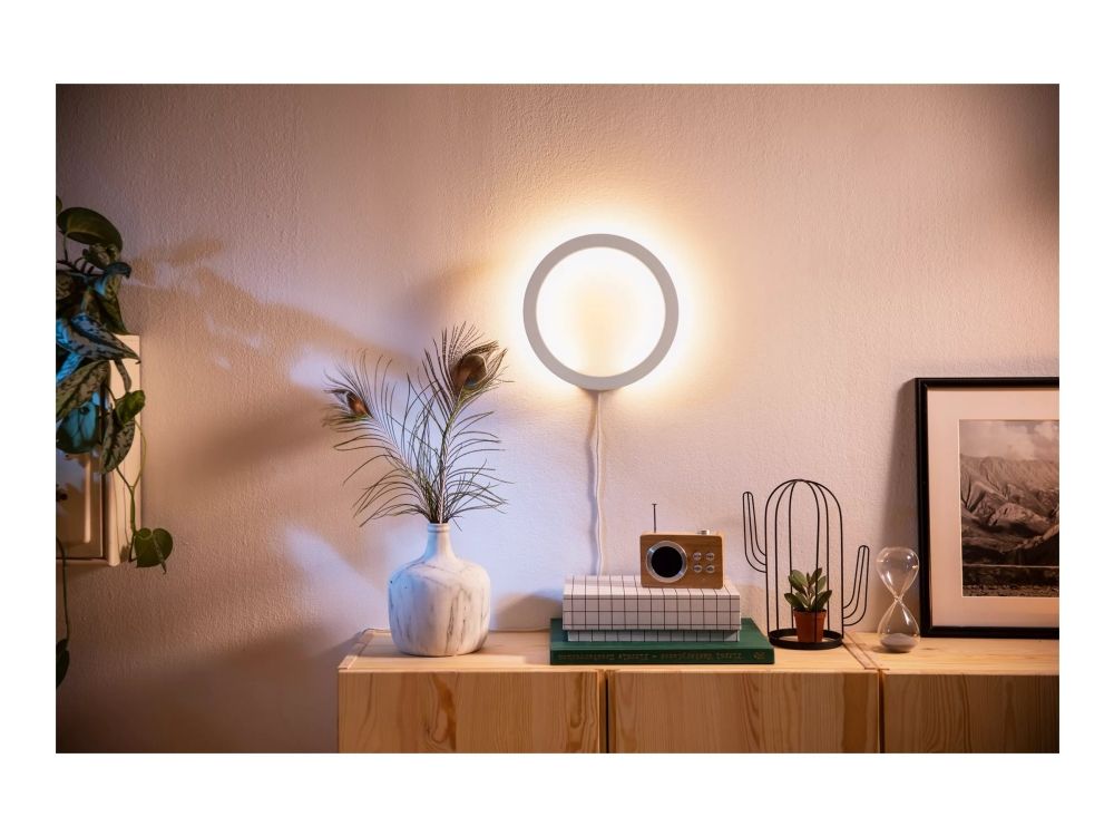 Sana-vegglampen har en slank design og en indirekte lyseffekt som setter et moderne preg på interiøret. Skap perfekt stemning med en hvilken som helst nyanse av hvitt eller farget lys. Lampen kan brukes separat eller inngå i det smarte belysningssystemet ditt med Hue Bridge.