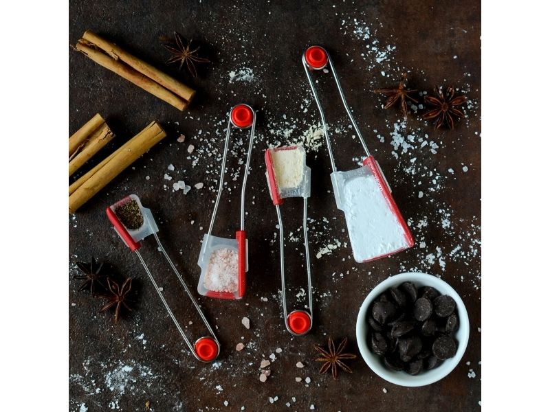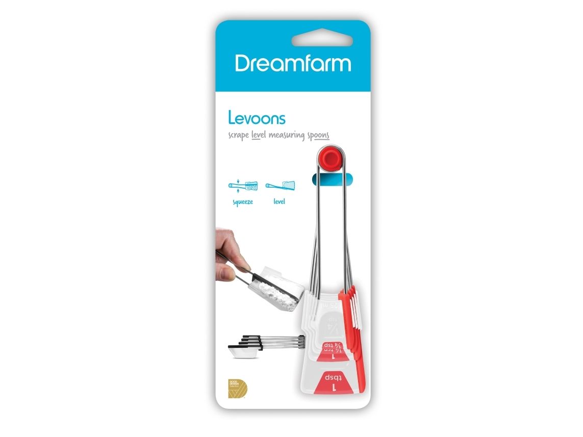 Levoons er Dreamfarms geniale måleskeer – et musthave til enhver køkkenskuffe. De ligner almindelige måleskeer, indtil du klemmer deres håndtag for at få en skraber til at stryge henover og skubbe alle de overskydende ingredienser af, hvilket giver dig en præcis måling.