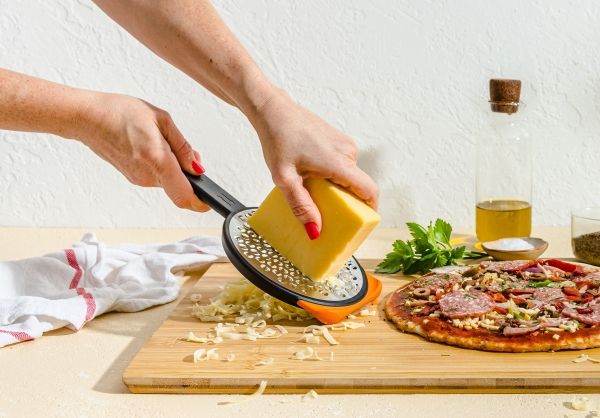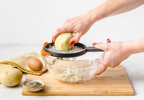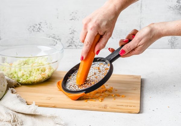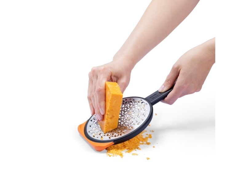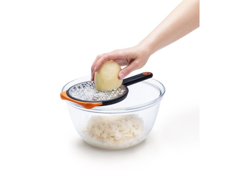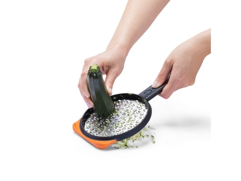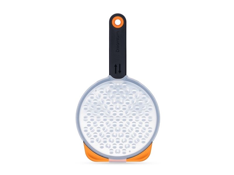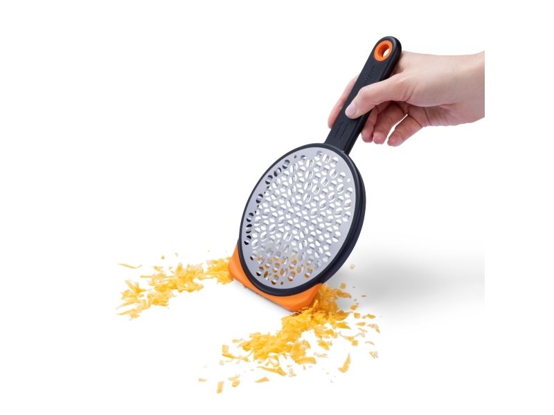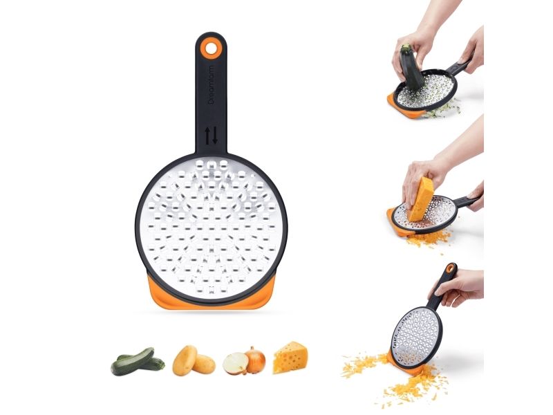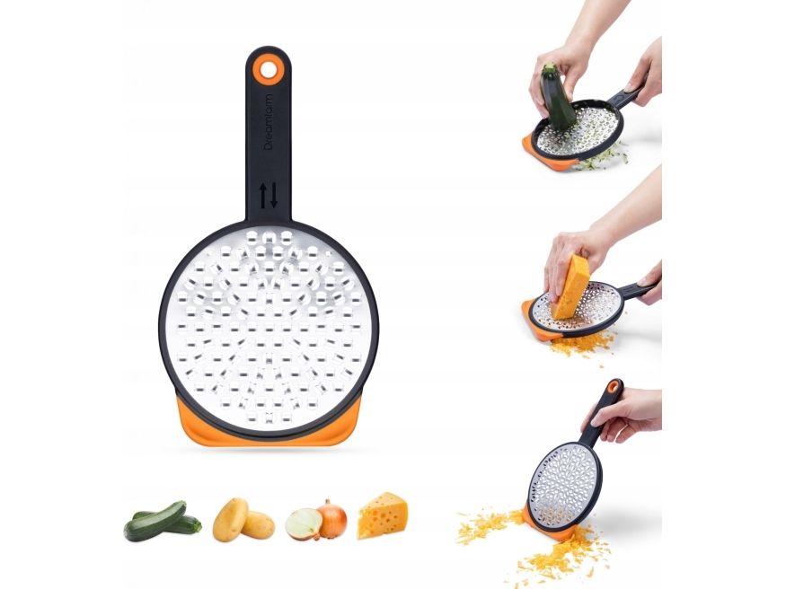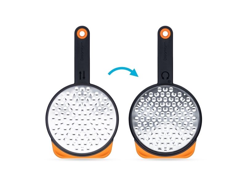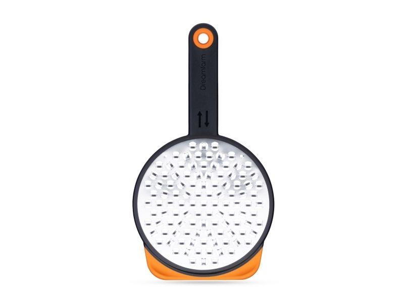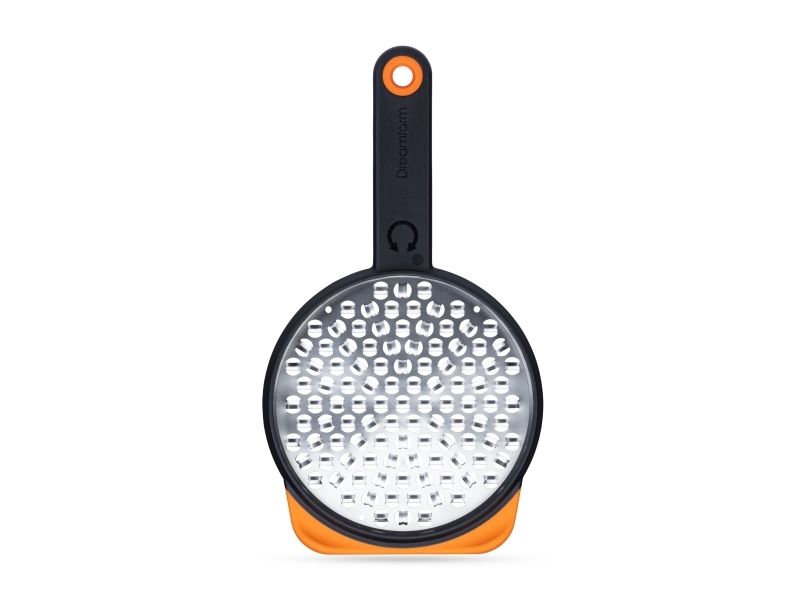 Orgrate fra Dreamfarm er et tosidet rivejern, der kontinuerligt arbejder i en cirkulær bevægelse på den ene side, og en op- og ned bevægelse på den anden. Bladene på nederste side rives i en cirkulær bevægelse til hurtigrivning af fødevarer som gulerødder og zucchini, og inkluderer en styrekant til nem rivning i begge retninger. De øverste sideblade rives i både op- og nedadgående bevægelser for effektiv rivning til eks. ost. Skridsikker fod giver kontrol, mens den river på flade overflader, fungerer som en skraber og hægter sig også på kanten af en skål. Leveres med et unikt sikkerhedscover, der nemt klikkes på til beskyttelse af de skarpe knive, så Orgrate nemt kan opbevares i skuffen. Materiale er polypropylen, rustfrit stål, TPE. Tåler opvaskemaskine. BPA fri. 6mm - grov.