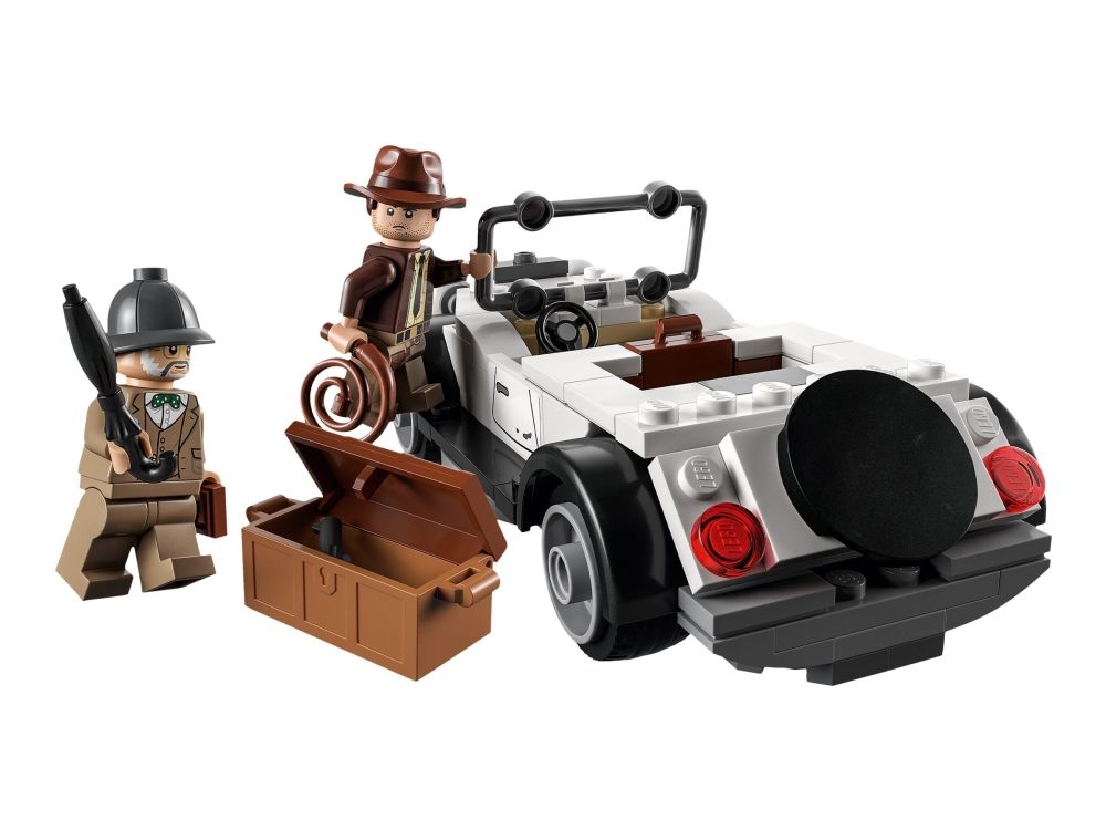 2. Tre minifigurer – inkluderer Indiana Jones™ med sin velkjente pisk, faren hans, professor Henry Jones Sr.™ som holder en dagbok. Den byggbare lekebilen har plass til begge to, og settet inkluderer også en pilot som flyr det byggbare flyet