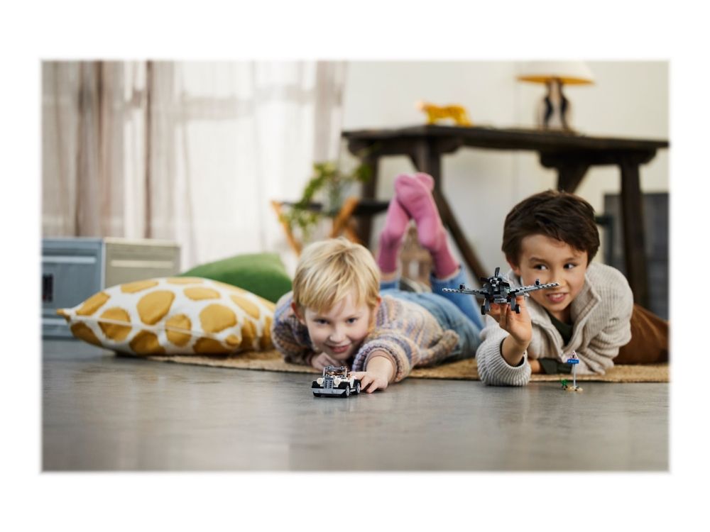 LEGO® Indiana Jones™ Jagerfly-oppdrag (77012) inneholder alt barn fra åtte år trenger for timevis med kreativ lek. Lekesettet inkluderer et tøft jagerfly med propell, to knotteskytere og avtakbare vinger, samt en supertøff veteran-kabriolet med koffert baki, som inneholder en paraply og en pistol.