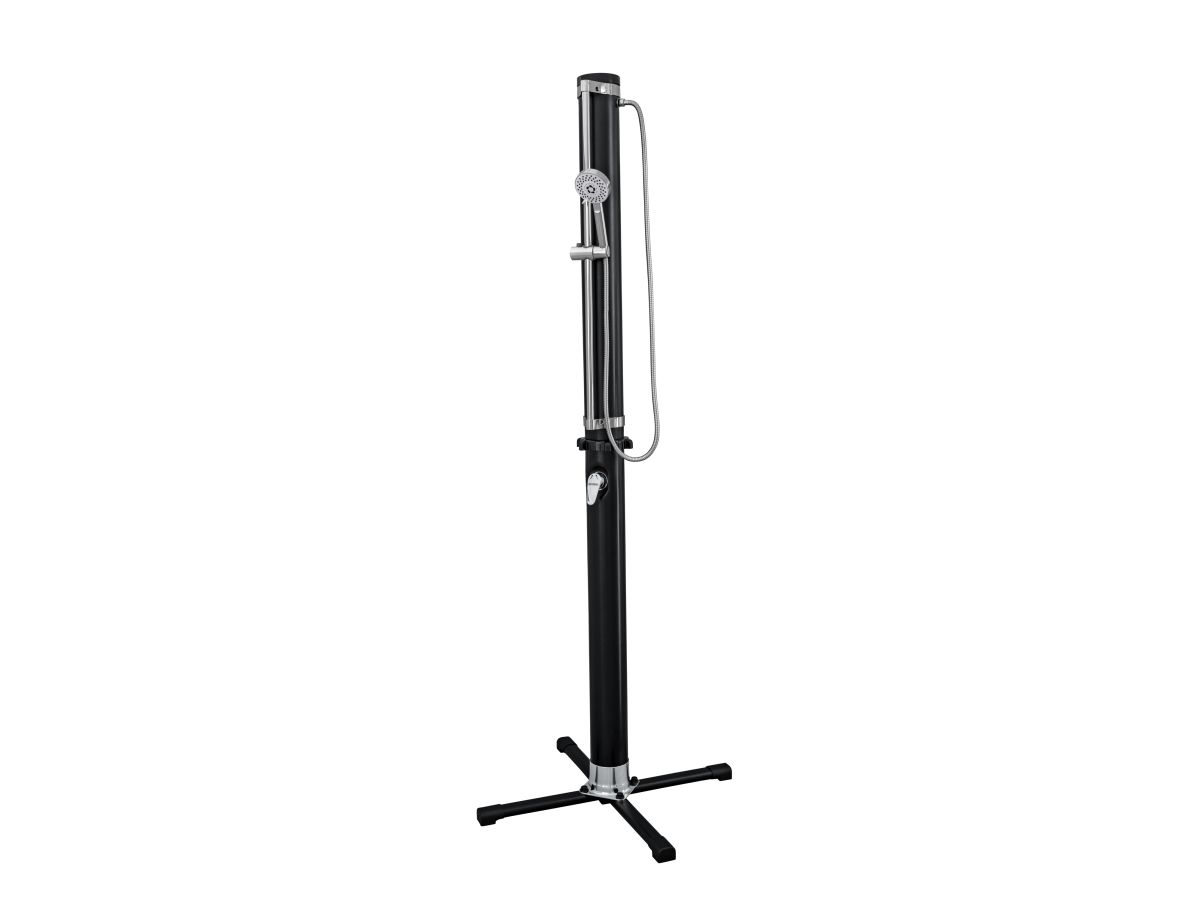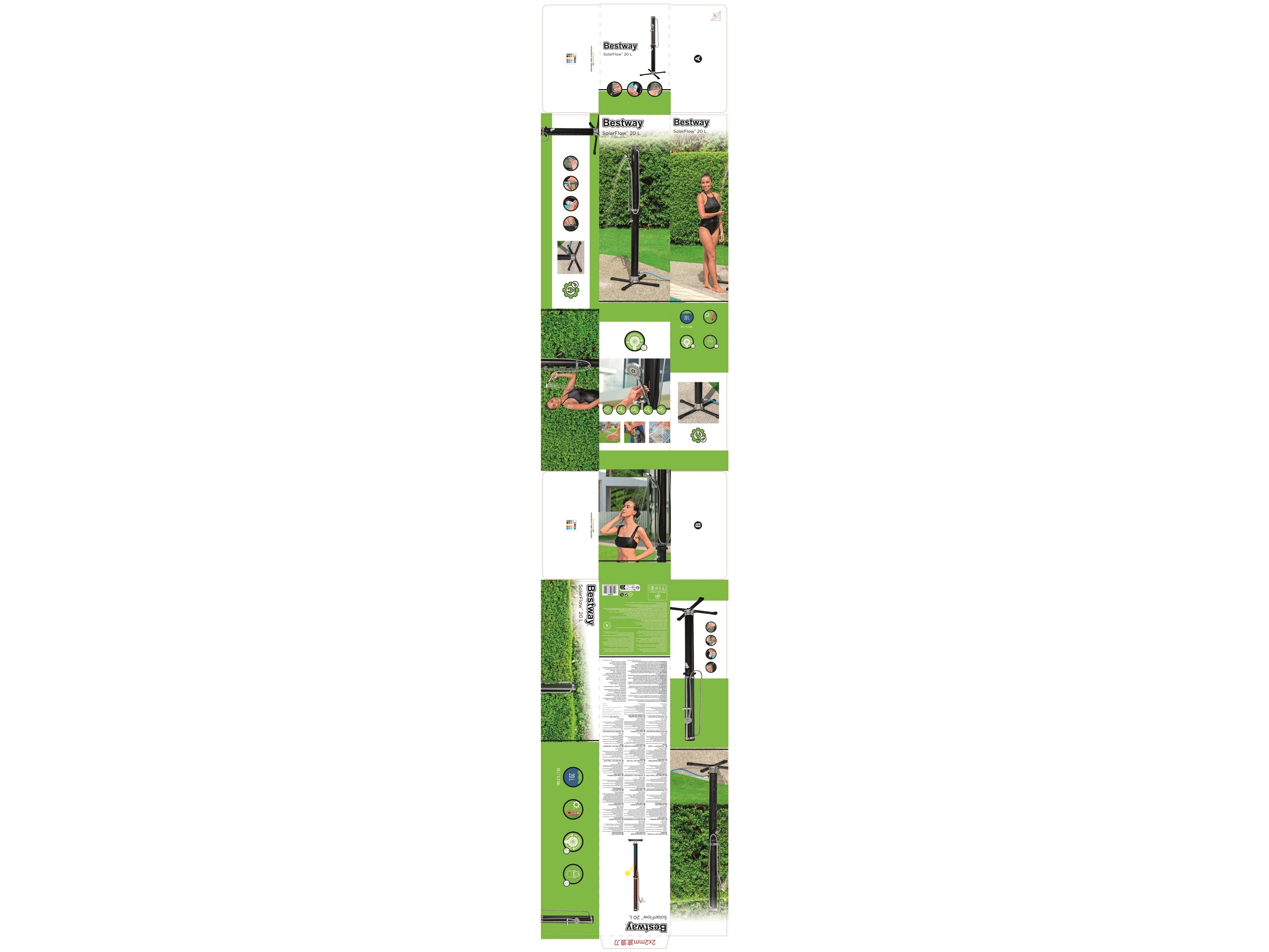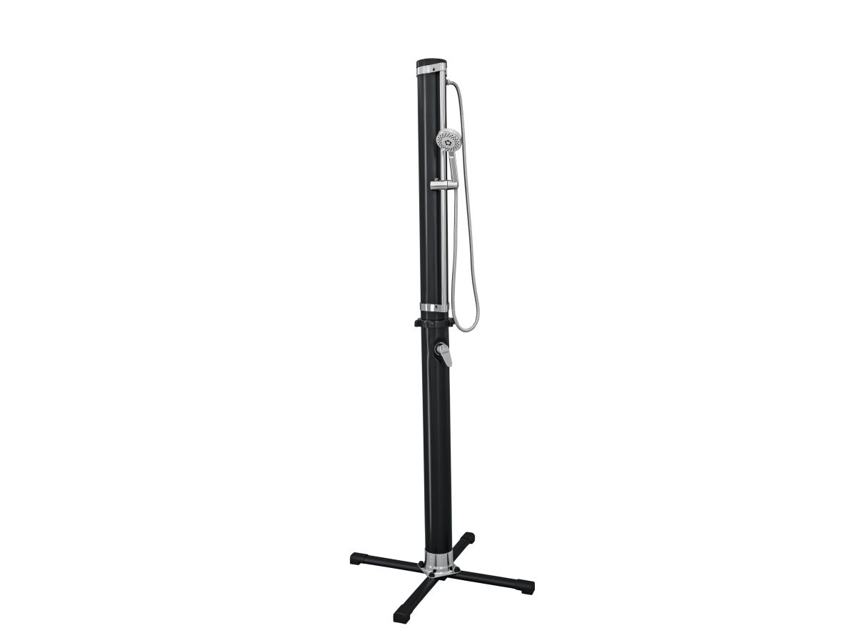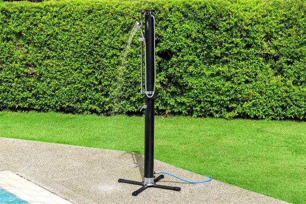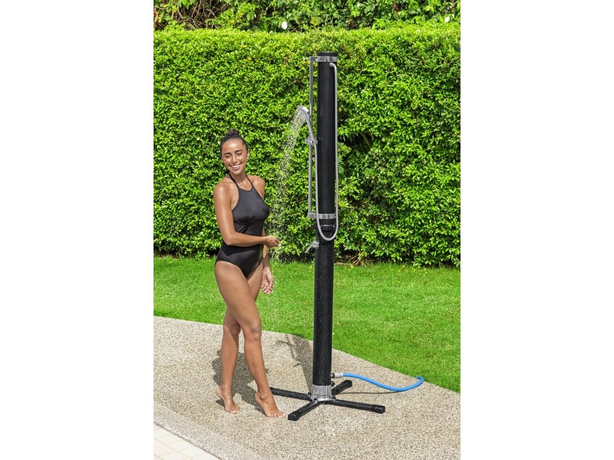 Vask dig, inden du går tilbage til poolen eller huset med Bestway® SolarFlow? 20 L udendørs bruser. Denne praktiske bruser er perfekt til poolejere, udendørsentusiaster, beachvolleyspillere og alle, der gerne vil i bad efter deres udendørsaktiviteter, og den har et justerbart brusehoved, der kan vippe, bevæge sig op og ned, bruges fast over hovedet eller håndholdt. Desuden kan du nyde flere stråleindstillinger, herunder regn, puls, jet, jet+puls, regn+puls. Fastgør bruseren til den medfølgende base (højden er 2,18 m, og basen er 63 cm x 63 cm) for ekstra støtte, og flyt bruseren, hvor du vil, når som helst, eller fastgør den direkte til en terrasse eller gårdhave ved dens base. Tilslut den til en almindelig haveslange (slange medfølger ikke) med et af de hurtige stik, og brug det nemme, justerbare håndtag til vandgennemstrømning og temperatur til at skabe den ideelle bruseoplevelse. Vil du have et varmt og lækkert brusebad næste gang? Efterlad vand i brusebadets 20 L (5,2 gal.) reservoir, og lad solen opvarme vandet. Lad de gode tider flyde! Sort 20 L bruserreservoir lader solen varme vandet Nemt at montere på en medfølgende fod, eller på de fleste overfladetyper Stor fod giver stabilitet Justerbart bruserhoved kan bruges i fast beslag eller håndholdt med flere stråleindstillinger Justerbart vandflow- og temperaturstyringsgreb Lynkobling til dem tilslutning til en haveslange (slange medfølger ikke) Indhold: 1 bruser