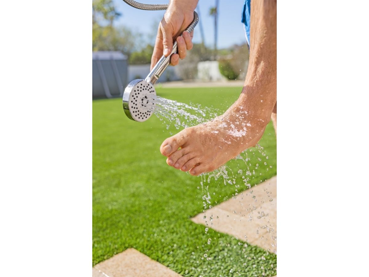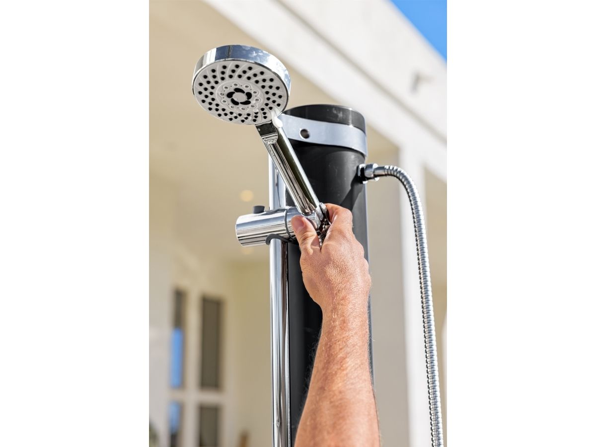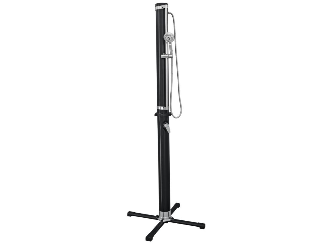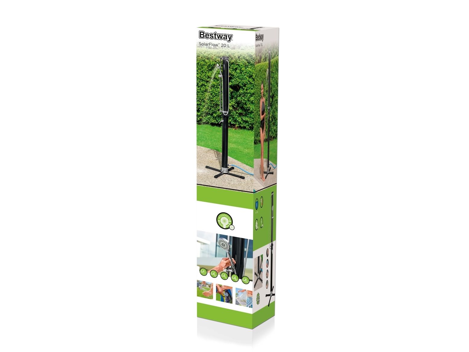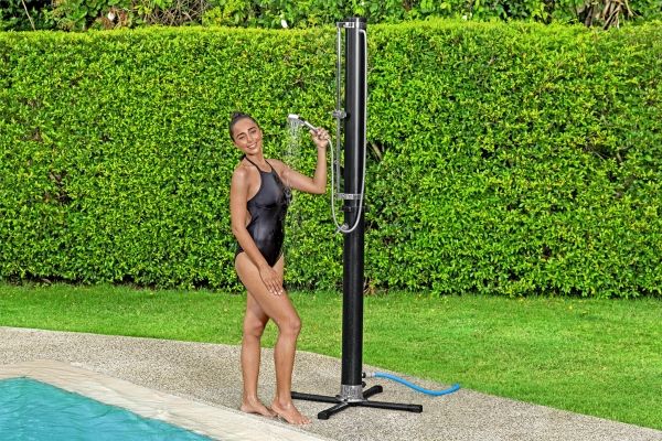 Vask dig, inden du går tilbage til poolen eller huset med Bestway® SolarFlow? 20 L udendørs bruser. Denne praktiske bruser er perfekt til poolejere, udendørsentusiaster, beachvolleyspillere og alle, der gerne vil i bad efter deres udendørsaktiviteter, og den har et justerbart brusehoved, der kan vippe, bevæge sig op og ned, bruges fast over hovedet eller håndholdt. Desuden kan du nyde flere stråleindstillinger, herunder regn, puls, jet, jet+puls, regn+puls. Fastgør bruseren til den medfølgende base (højden er 2,18 m, og basen er 63 cm x 63 cm) for ekstra støtte, og flyt bruseren, hvor du vil, når som helst, eller fastgør den direkte til en terrasse eller gårdhave ved dens base. Tilslut den til en almindelig haveslange (slange medfølger ikke) med et af de hurtige stik, og brug det nemme, justerbare håndtag til vandgennemstrømning og temperatur til at skabe den ideelle bruseoplevelse. Vil du have et varmt og lækkert brusebad næste gang? Efterlad vand i brusebadets 20 L (5,2 gal.) reservoir, og lad solen opvarme vandet. Lad de gode tider flyde! Sort 20 L bruserreservoir lader solen varme vandet Nemt at montere på en medfølgende fod, eller på de fleste overfladetyper Stor fod giver stabilitet Justerbart bruserhoved kan bruges i fast beslag eller håndholdt med flere stråleindstillinger Justerbart vandflow- og temperaturstyringsgreb Lynkobling til dem tilslutning til en haveslange (slange medfølger ikke) Indhold: 1 bruser