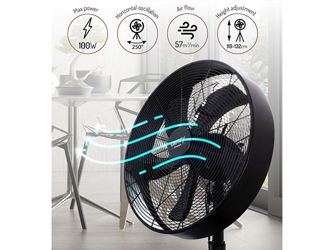 It is a model that will work well in large areas. Lofts and industrial spaces require devices with more power and a slightly different appearance to fit into the design and finish the style of the apartment. The diameter of 40 centimeters and the airflow of 57 m3/minute guarantee that the air will be evenly distributed even in a larger room. The telescopic tripod, in turn, is an option how to make gusts of air rise above people sitting in armchairs, chairs, or lying on beds and not blow directly on people.