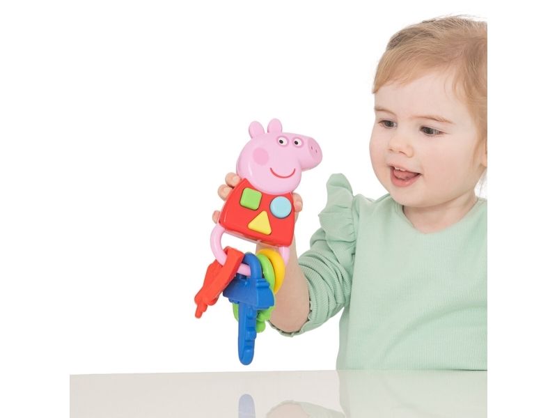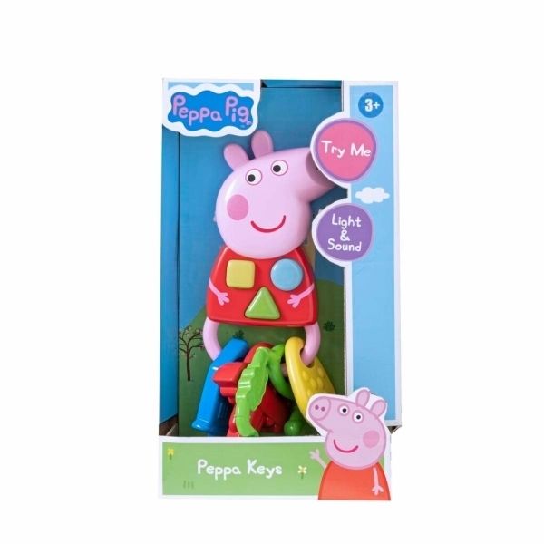 Shake, rattle and go with Peppa's Keys! Little ones can press the light up buttons to hear fun sounds along with the Peppa Theme Tune. Includes colourful keys in the shape of Peppa's house and family car made out of soft plastic making it the perfect option for teething youngsters. Designed to be chunky with various grasping points for little hands to hold. Features a hook that allows you to attach the toy to various surfaces to keep it safe and secure. Made to stimulate your child's senses.