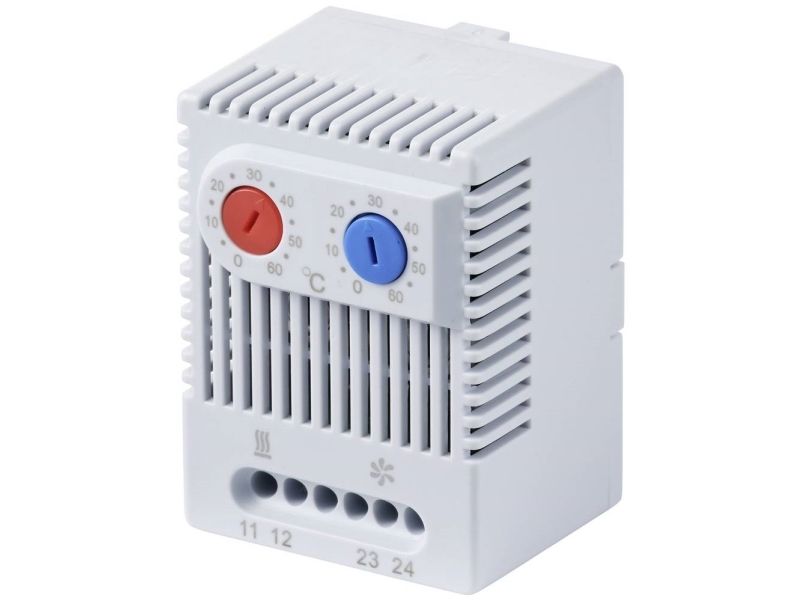 Kontaktskab-termostat har et indstillingsområde på 0°C til +60°C. Koblingsspændingen udgør maks. 250 V/AC.