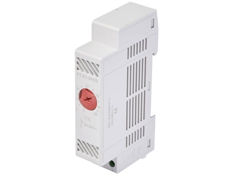 Kontaktskab-termostat har et indstillingsområde på 0°C til +60°C. Koblingsspændingen udgør maks. 250 V/AC.