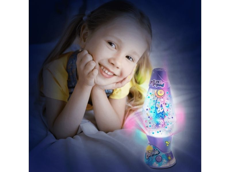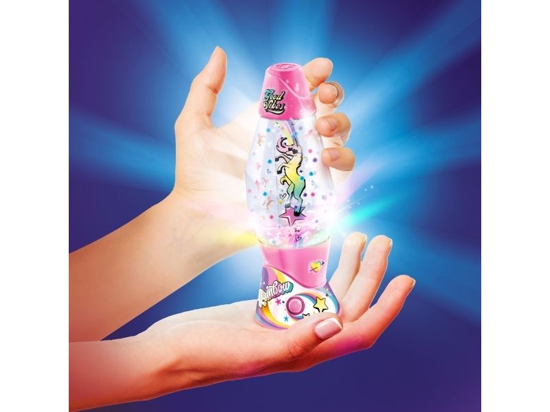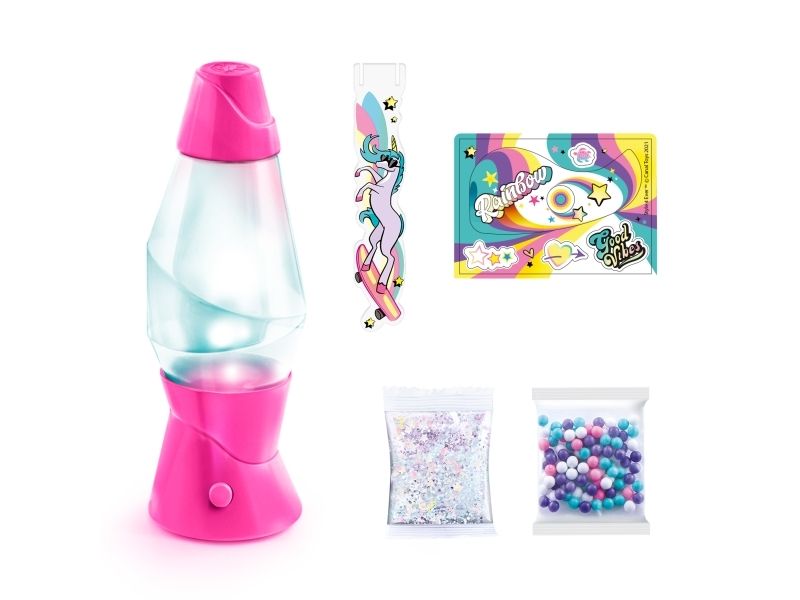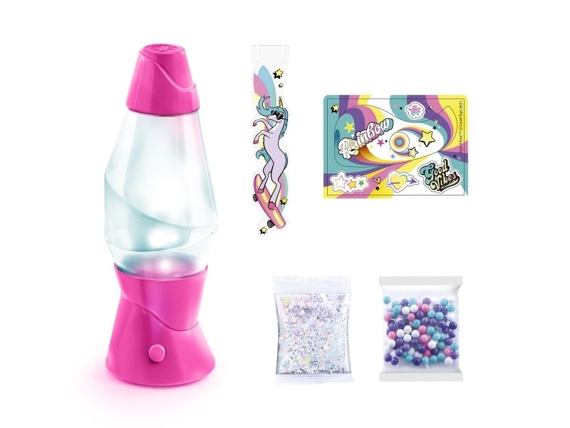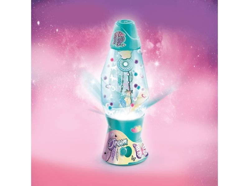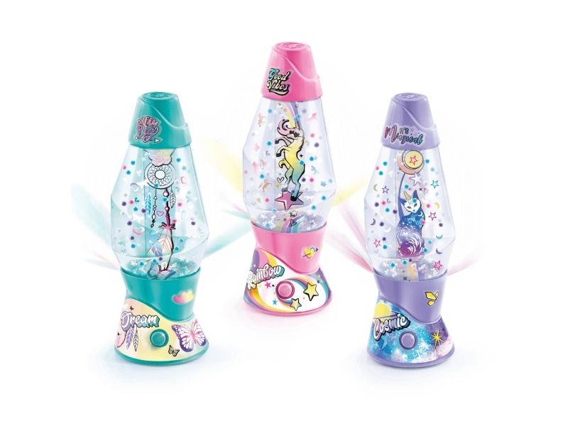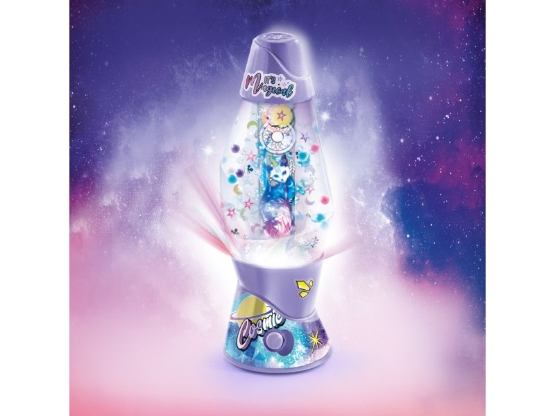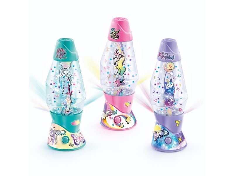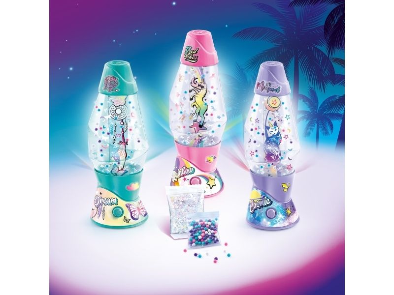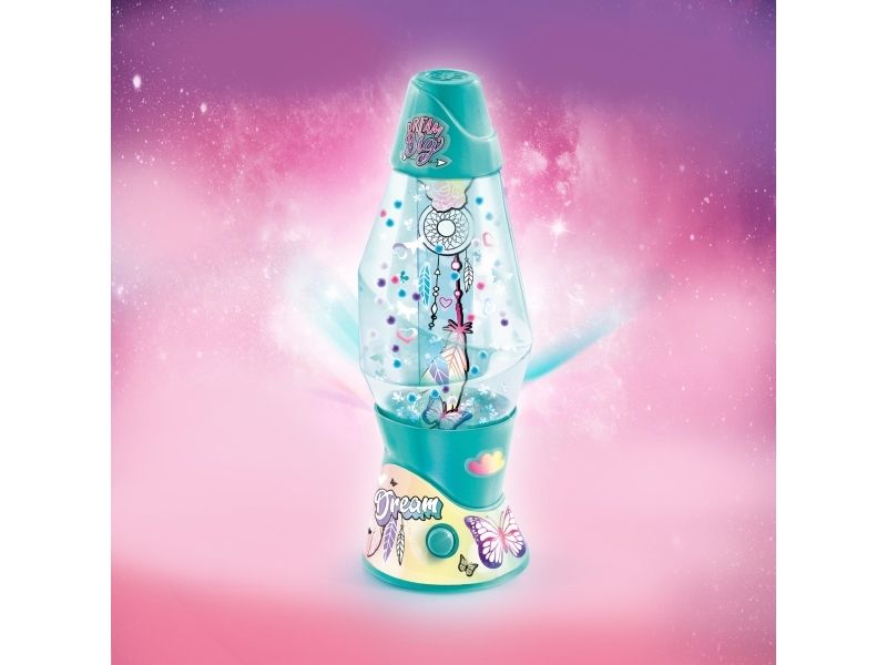 Lag din egen lavalampe! Med den medfølgende dekorasjonen, klistremerkene og perlene kan du faktisk designe lampen din slik du vil. Bare bland, dekorer og trykk for å få det flerfarget LED-lyset til å fungere. Lampen måler 15,5 cm i høyden og er tilgjengelig i 3 temaer, Dream, Rainbow og Cosmic. Fra 6 år.