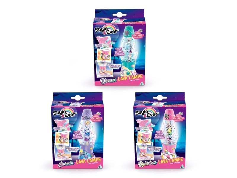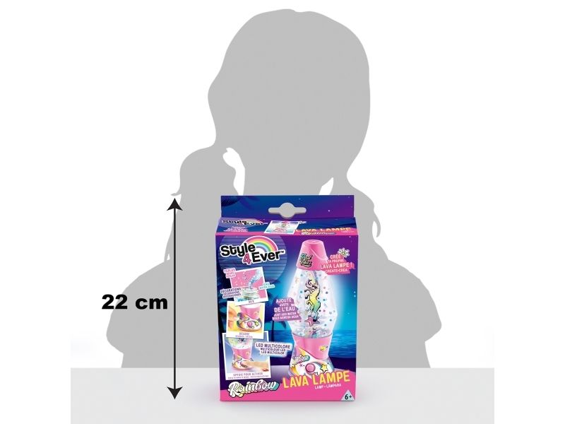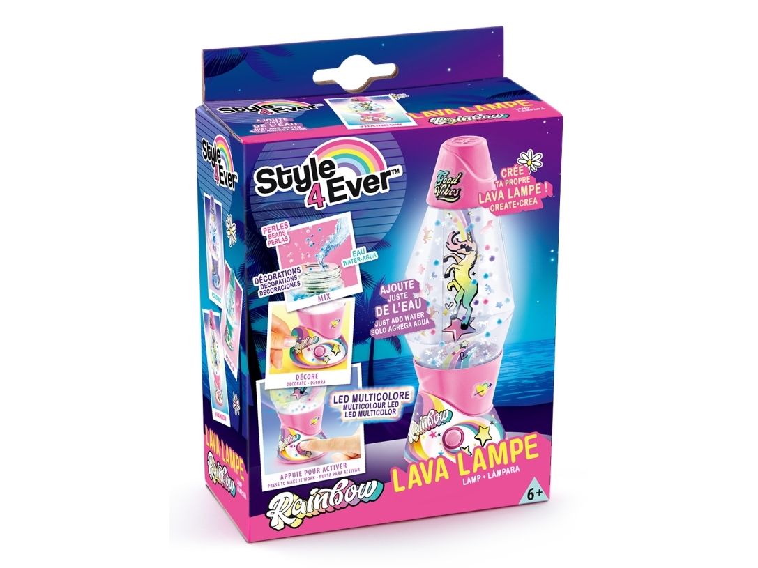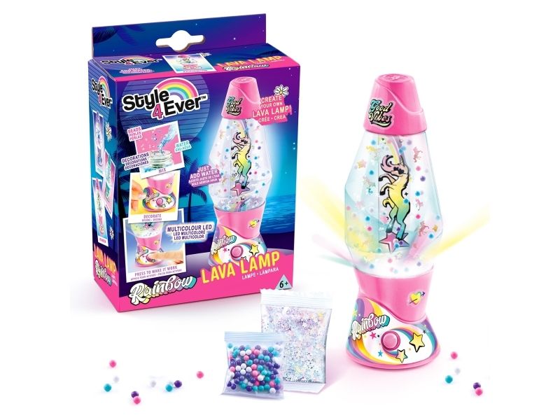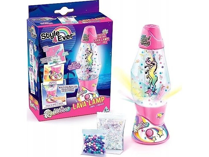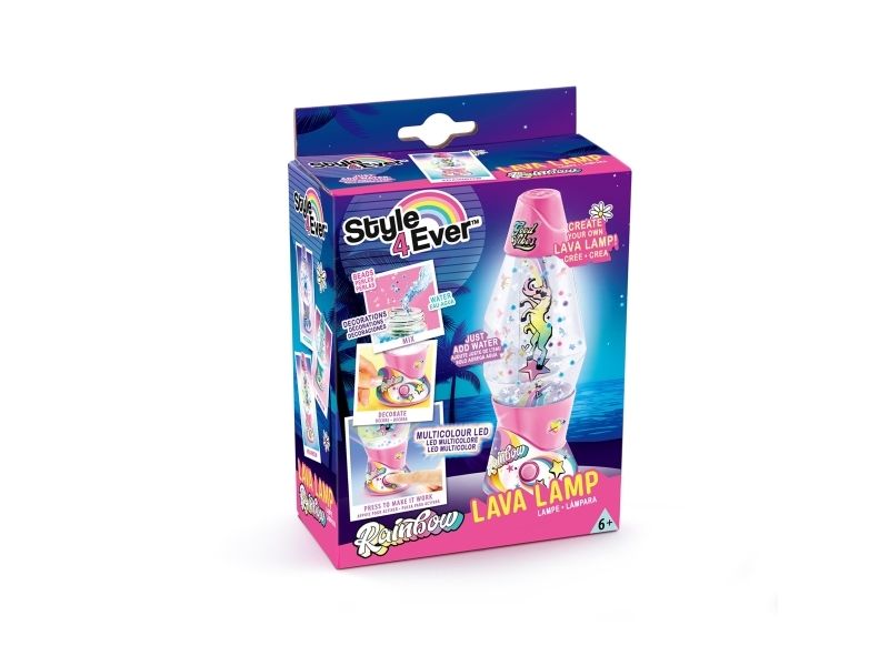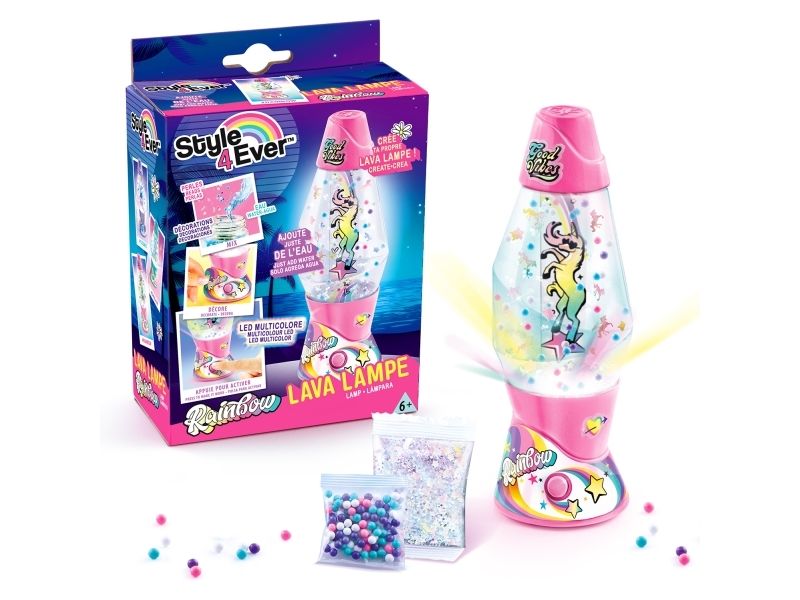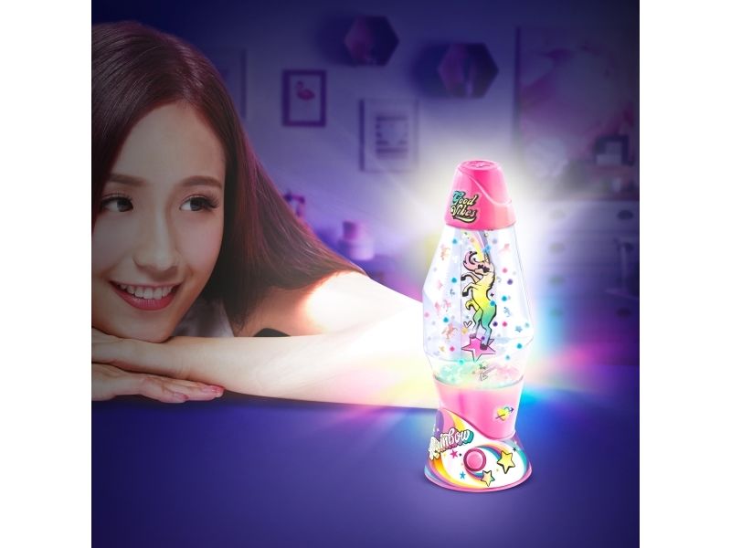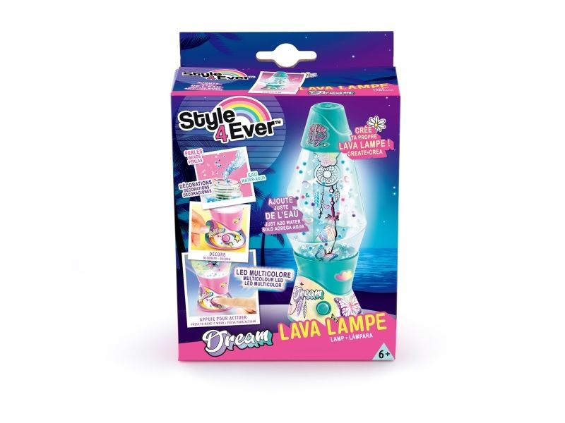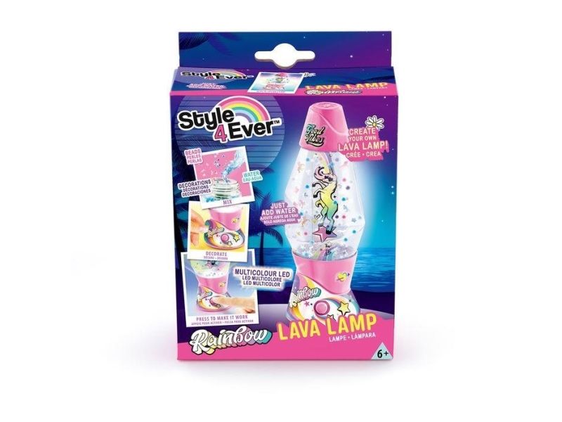 Lag din egen lavalampe! Med den medfølgende dekorasjonen, klistremerkene og perlene kan du faktisk designe lampen din slik du vil. Bare bland, dekorer og trykk for å få det flerfarget LED-lyset til å fungere. Lampen måler 15,5 cm i høyden og er tilgjengelig i 3 temaer, Dream, Rainbow og Cosmic. Fra 6 år.