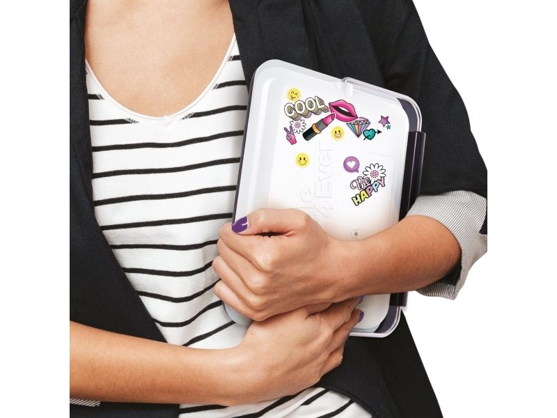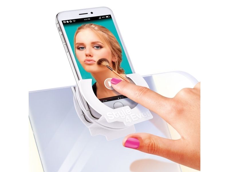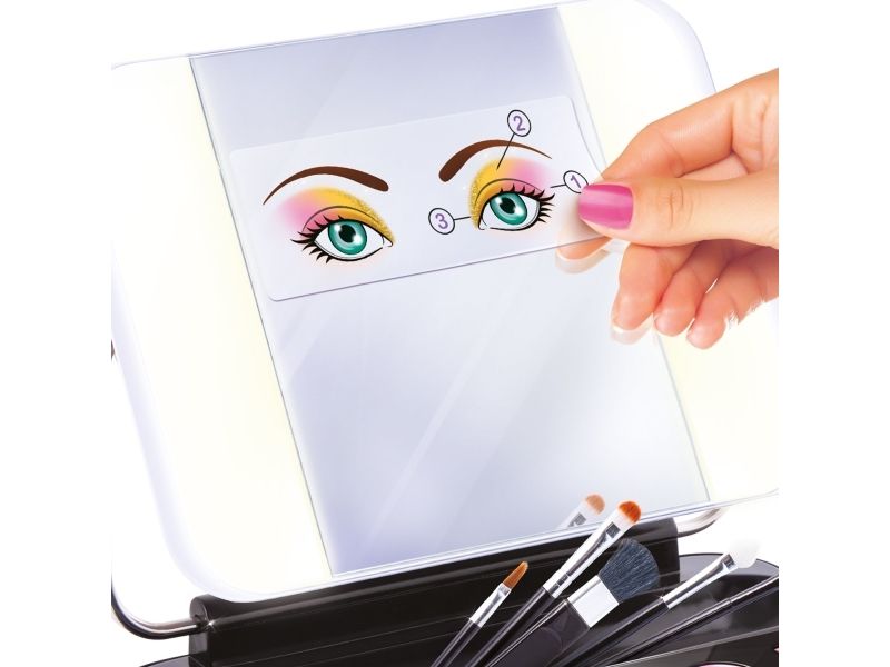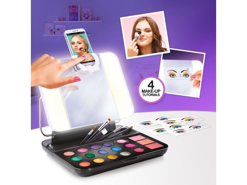 Sminke som en proff! Sminkeetuiet har et speil med LED-lys inni og kommer med 4 sminkeveiledninger som du kan feste på speilet - den perfekte måten å lære å legge sminke på. Den kommer også med en avtakbar telefonholder så du kan se favorittveiledningene dine eller filme deg selv når du bruker sminke. Krever 4 x 1,5V AA/LR06-batterier (ikke inkludert) Fra 8 år og oppover.