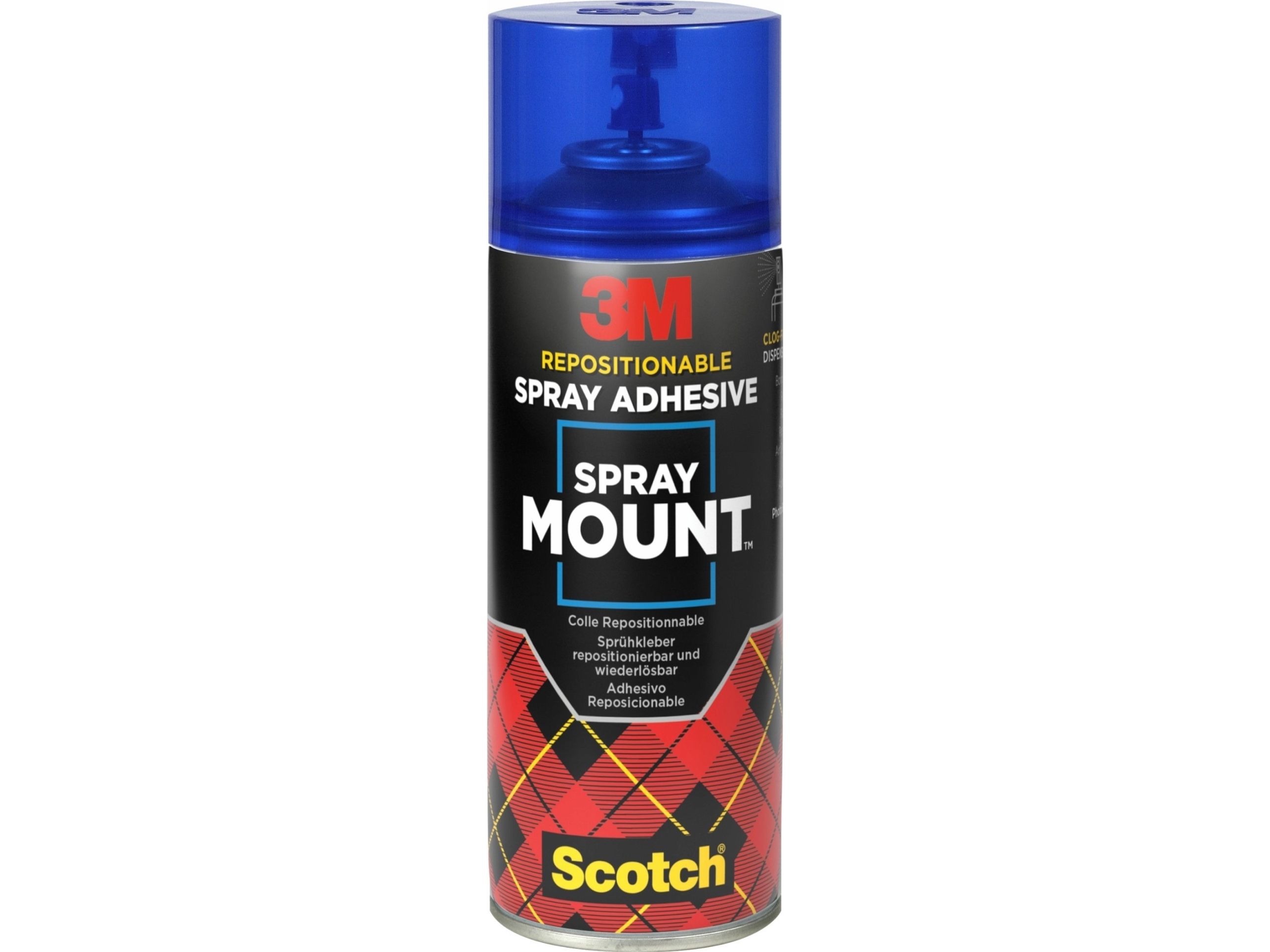Scotch® SprayMount™ klæbemiddel giver fremragende indledende vedhæftning, men giver mulighed for midlertidigt at løfte og flytte arbejdet. SprayMount™ er velegnet til opklæbning og kreative anvendelser, såvel som til fastklæbning og montering af de fleste typer af materialer. Det kontrollerede sprøjtemønster reducerer forstøvning af klæbemiddel væsentligt. Produktet giver en gennemsigtig og permanent klæbning og kan uden problemer anvendes til farvefotos, illustrationer, kort mv. Limen er syrefri og ødelægger ikke fotos. Velegnet til præsentationer, bygning af modeller, fotocollager, displaytavler, skoleprojekter, grafiske designs mv.