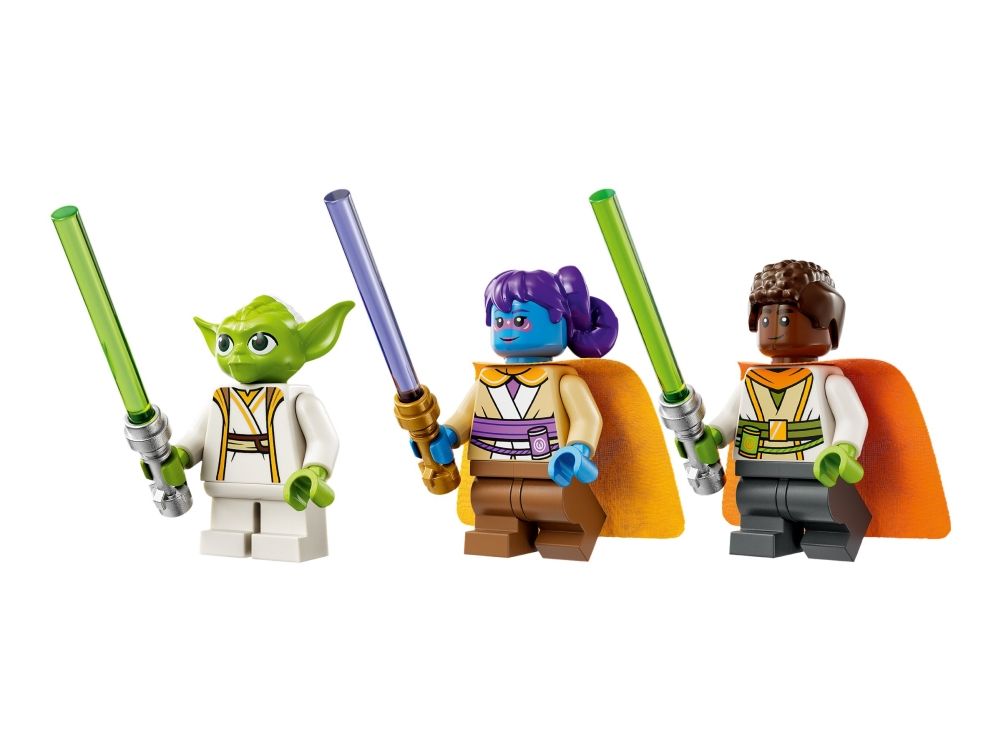 2. Tre LEGO® Star Wars™ minifigurer – Lys Solay og Kai Brightstar med mellomstore bein og mester Yoda med små bein. Alle figurene har lyssverd for jediopplæring