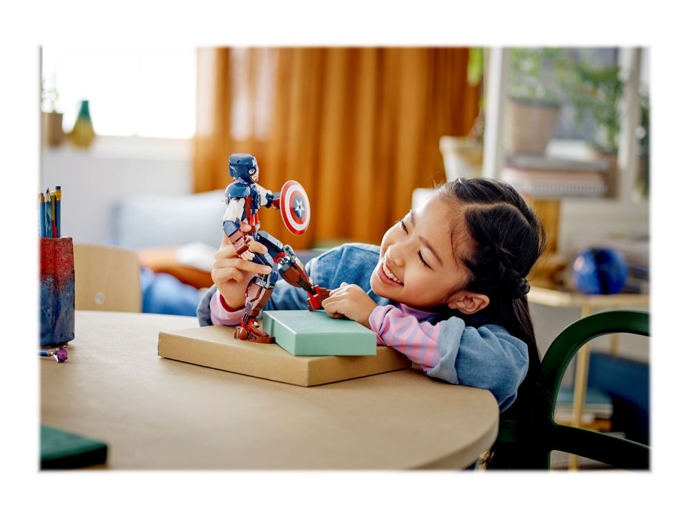 Denne Marvel Avengers samlerfiguren er gøyal å bygge og byr på utallige leke- og utstillingsmuligheter. Figuren har bevegelige skuldre, armer, hofter og bein, slik at barn kan stille den opp i tøffe positurer og iscenesette spennende oppdrag. Den bærbare lekefiguren har autentiske detaljer, inkludert figurens ikoniske skjold som kan festes til figurens hender eller rygg, avhengig av hva den actionfylte leken krever. For ekstra digital moro kan byggere zoome, rotere sett i 3D og spore framdriften sin med den gøyale og intuitive LEGO Builder appen.
