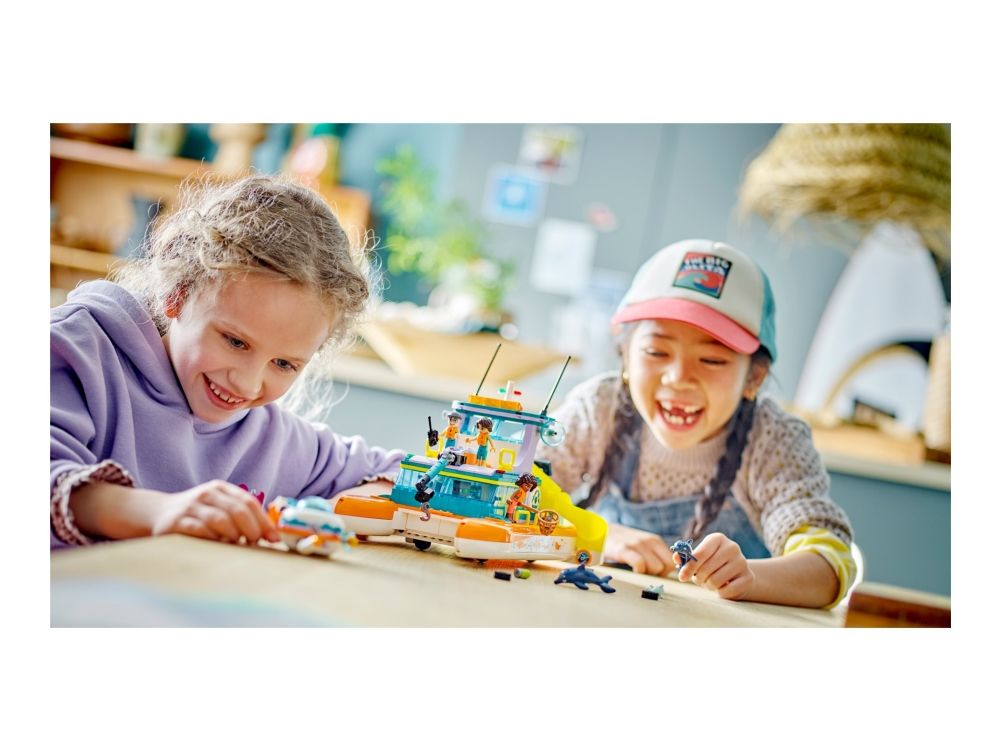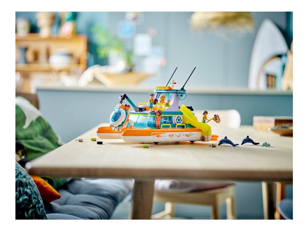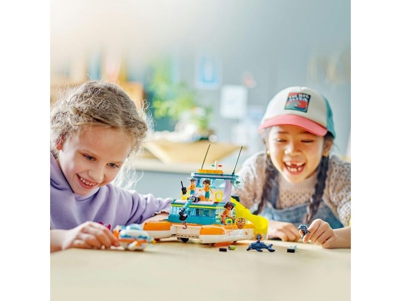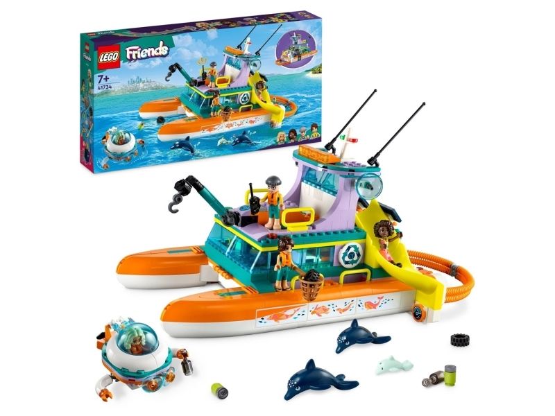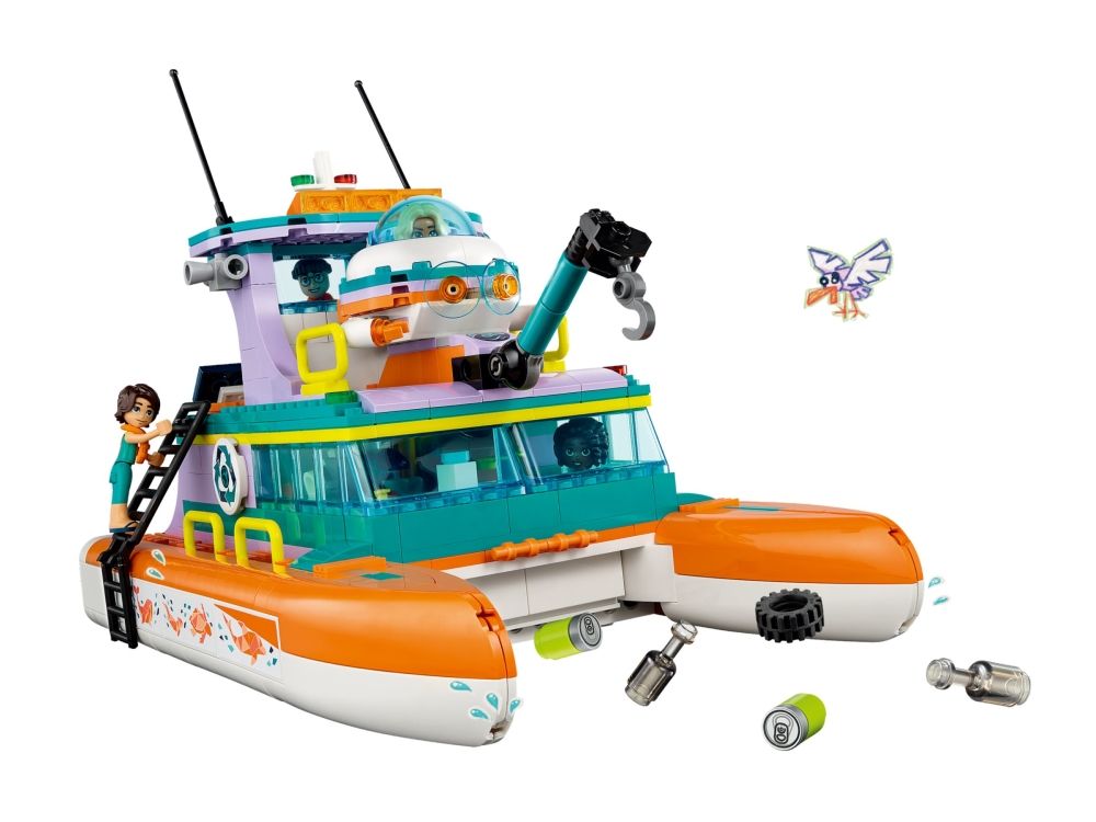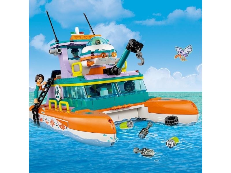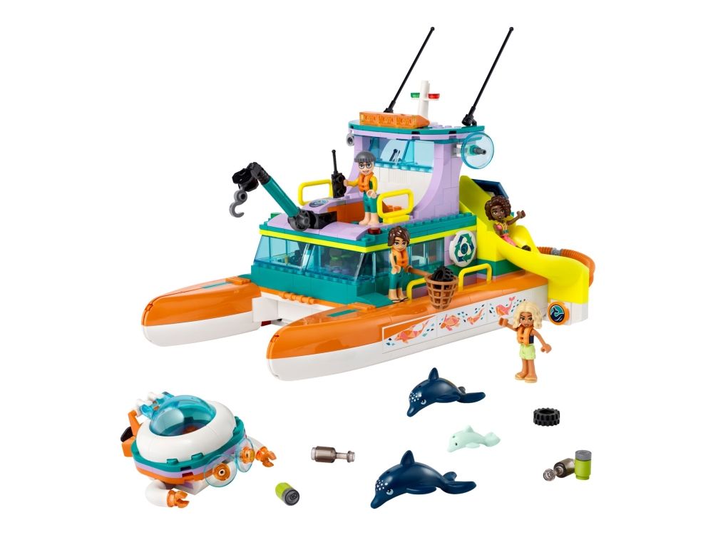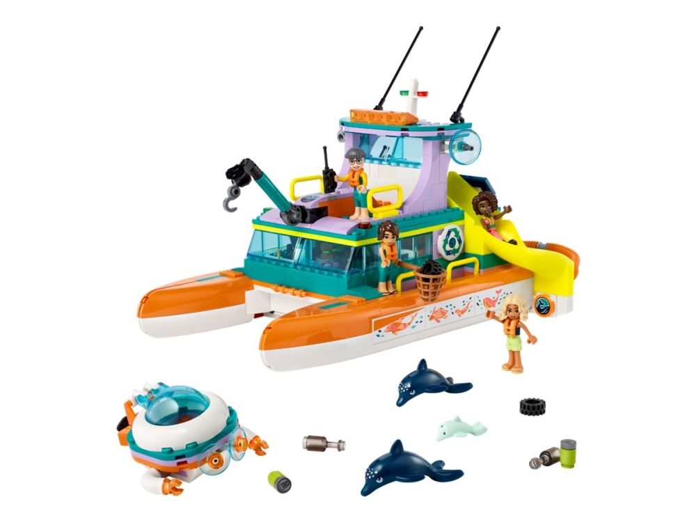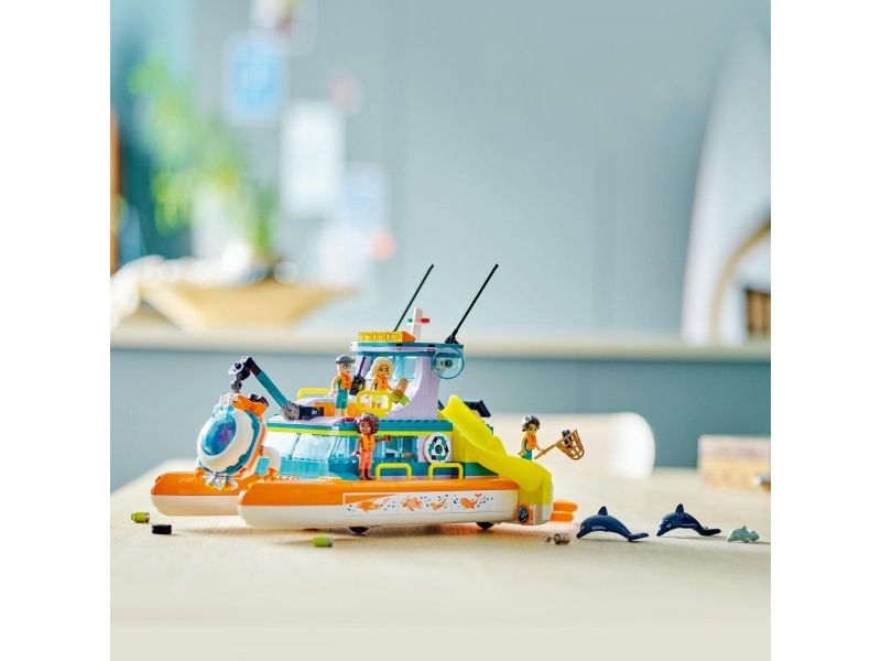 Naturinteresserte barn kan lære om livet i havet med det detaljerte byggelekesettet LEGO® Friends Redningsbåt for barn fra sju år. Settet inkluderer en byggbar katamaran som også er et laboratorium, samt en liten ubåtleke. Barn kan finne på spennende redningsoppdrag til havs og styre båten over søppel så det fanges opp av båtens nett, klart til å resirkuleres. Nova og Aliya trodde ikke de hadde så mye til felles, men de blir stadig bedre venner mens de jobber sammen på båten.